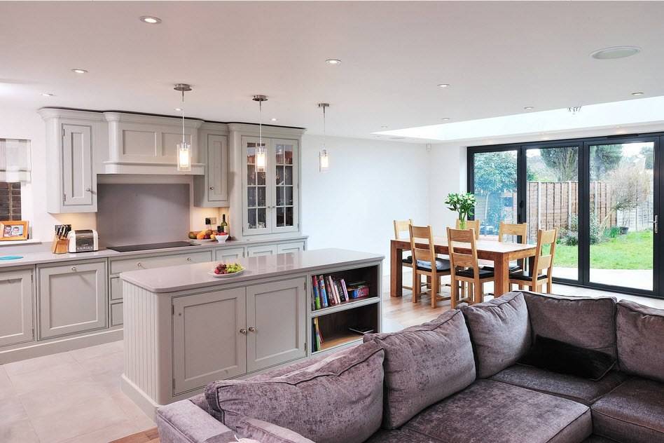 При совмещении типов помещений, когда создаётся кухня-столовая и кухня-гостиная, диван может выполнять ту же роль, что выполнял в обычной столовой и гостиной. При этом такие помещения гораздо просторнее, чем просто кухня, и вариантов для расположения, выбора дивана тоже больше.