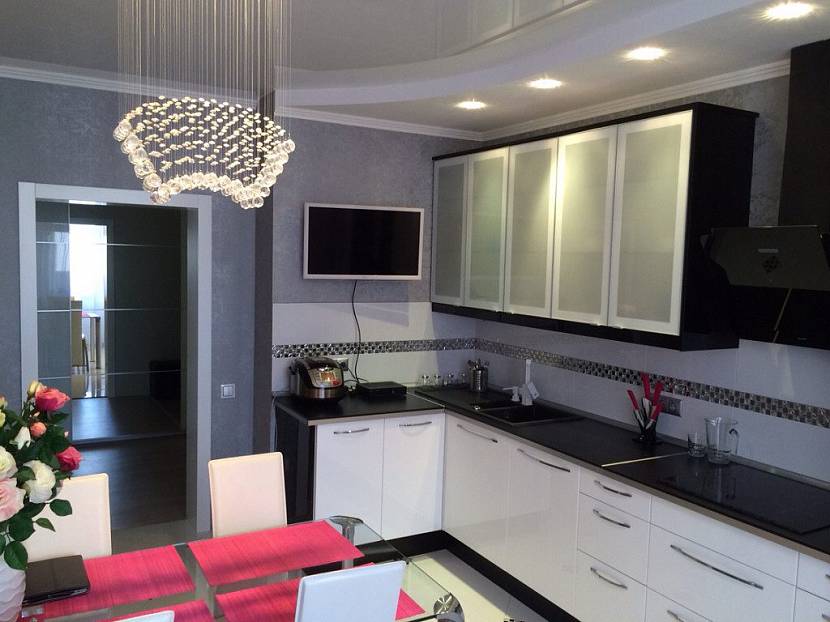 На фото – натяжные потолки с мебелью на всю высоту кухни.
