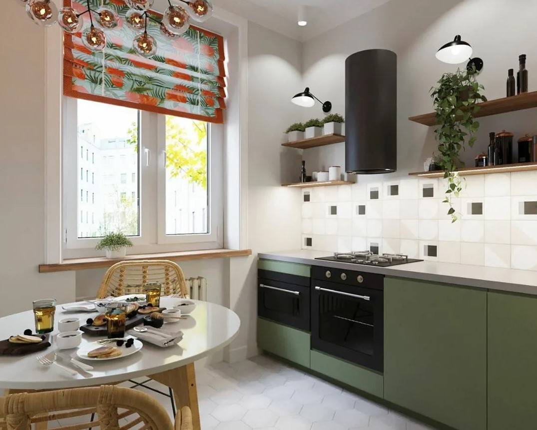 На кухне площадью 7 кв.м. не обязательно вешать шторы, но если необходимость спрятаться от солнца и посторонних глаз велика, рекомендуется остановиться на легких занавесках, жалюзи или шторах-кафе. Если их текстиль будет «созвучен» со скатертью, это придаст целостность дизайну.