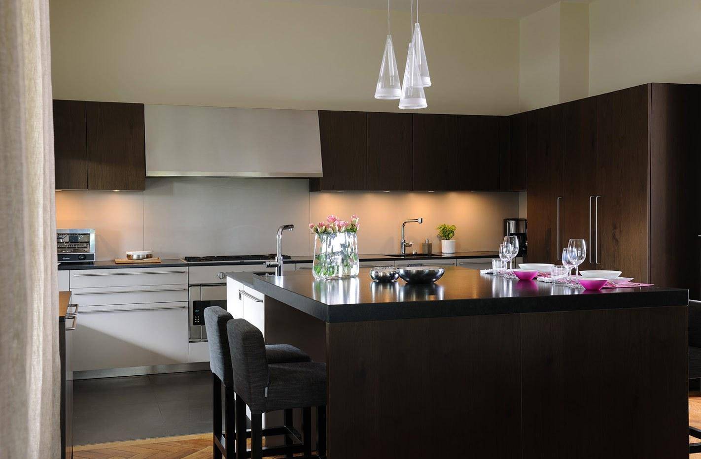 - Светодиодная подсветка фартука и столешницы. Самый важный свет который используется чаще всего и должен называться основным т.к. и столешницу освещает и достаточен чтобы зайти что-то взять или приготовить кофе. В большинстве кухонь допущена грубейшая ошибка — подсветка фартука включается кнопкой где-то на нём, потому что оставили её на ответственность кухонщиков. Нужно делать нормальную разводку и выводить включение подсветки на отдельную клавишу на входе в кухню и никак иначе.