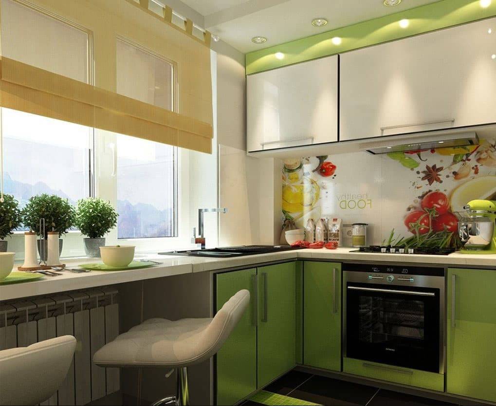 - Площадь 5-6 м2. Это совсем небольшие помещения, где рекомендуется рассматривать возможность расширения за счет балкона или гостиной. Но при отсутствии подобного лучше остановиться на Г-образной кухне, но с задействованием подоконника. Сегодня владельцы небольших площадей научились убирать привычный «хрущевский» холодильник и ставить на его место полноценный шкаф или мойку.