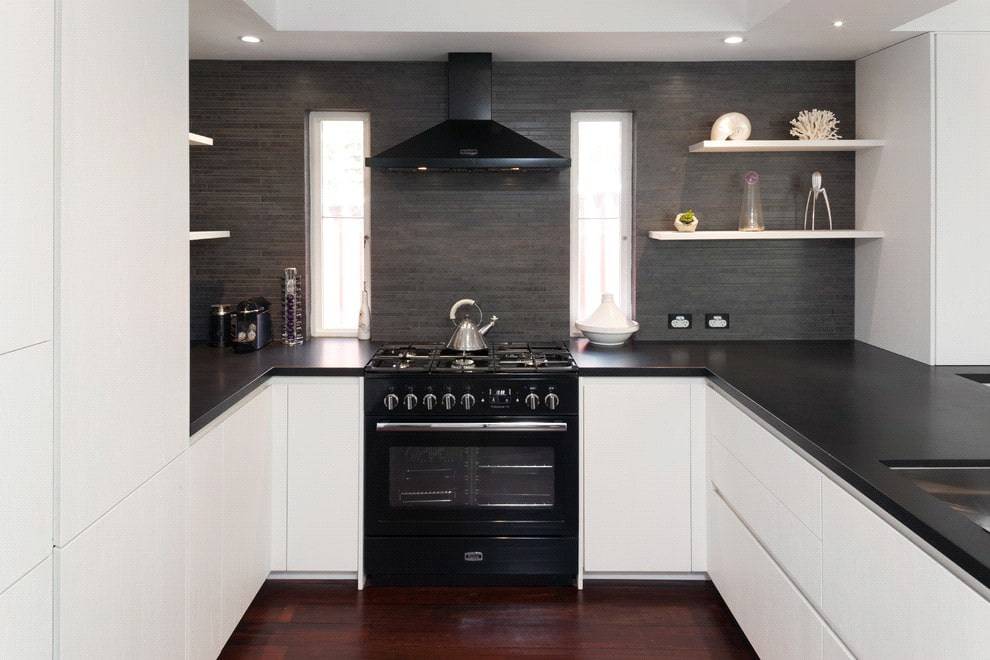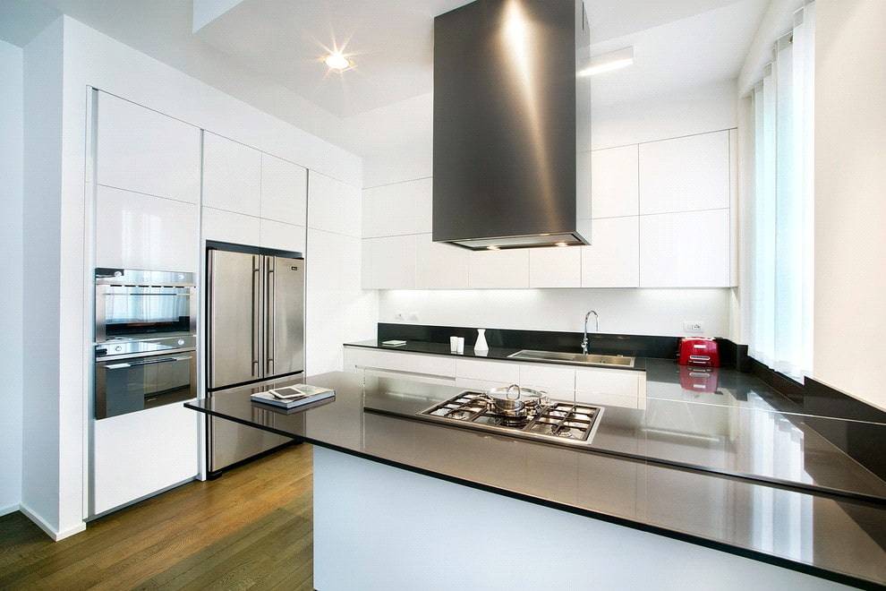 Рассмотрим популярные интерьеры, где белая кухня с черной столешницей выглядит уместно и стильно, подчеркивает особенности дизайна: