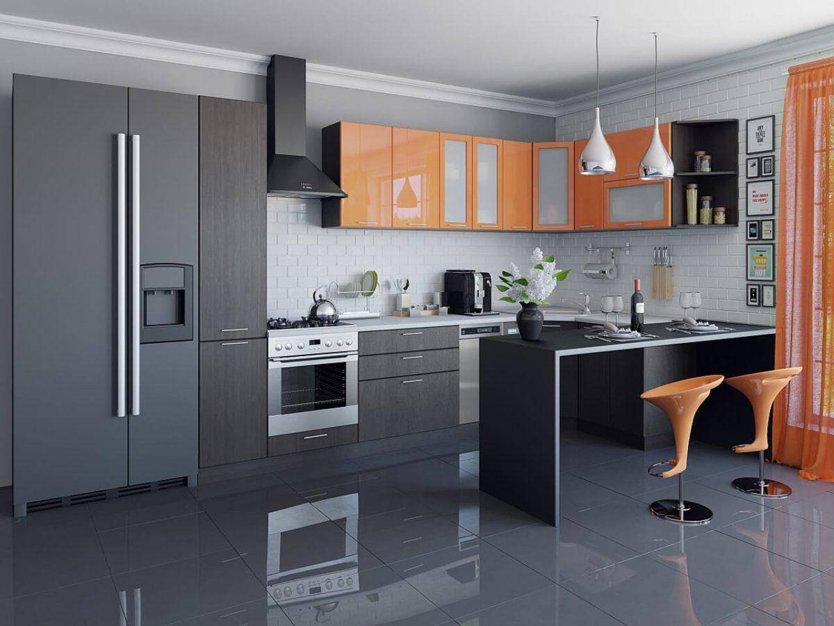 Хай-тек отличается серой гаммой, в которую идеально впишется белая кухня с черной столешницей. Больше подойдут функциональные модели с элементами металла, пластика;