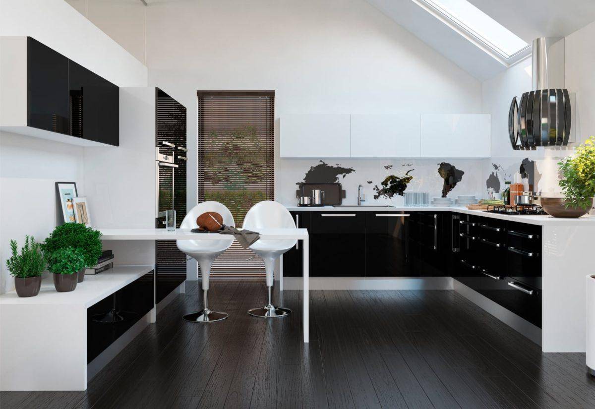 Рассмотрим достоинства и недостатки белой кухни с черной столешницей.