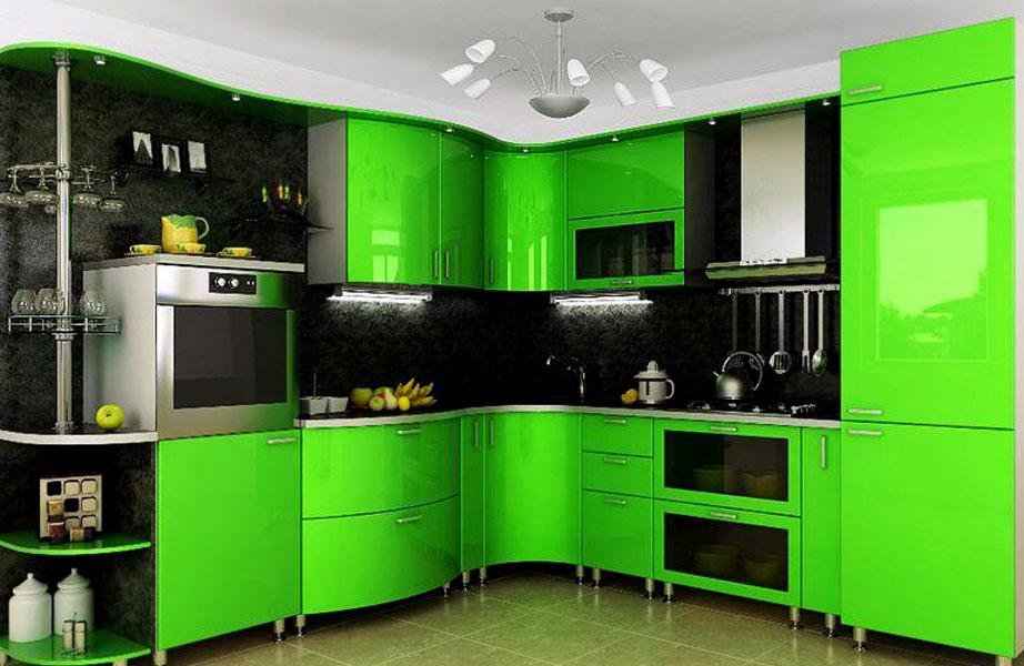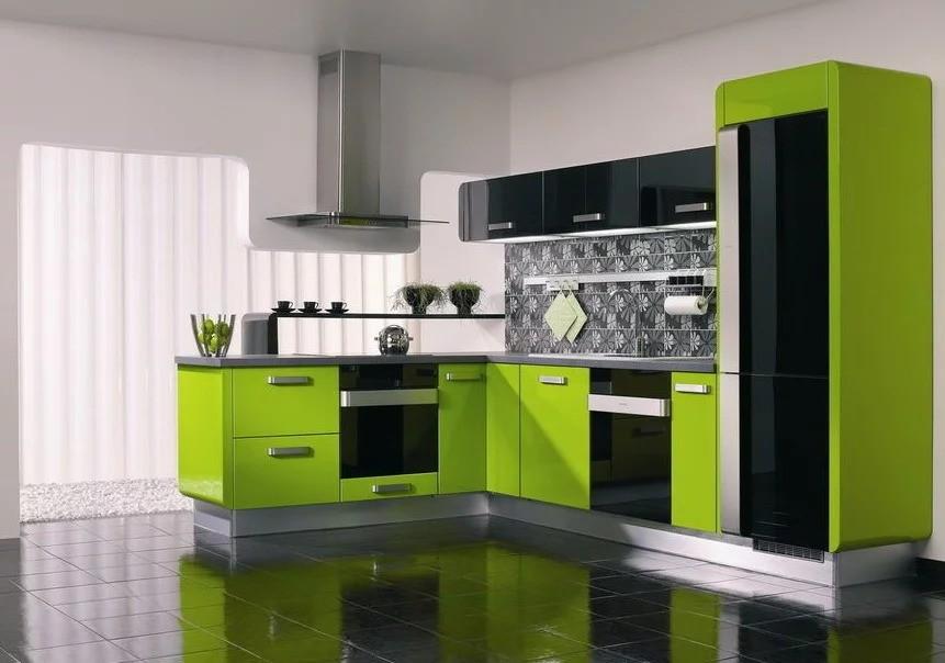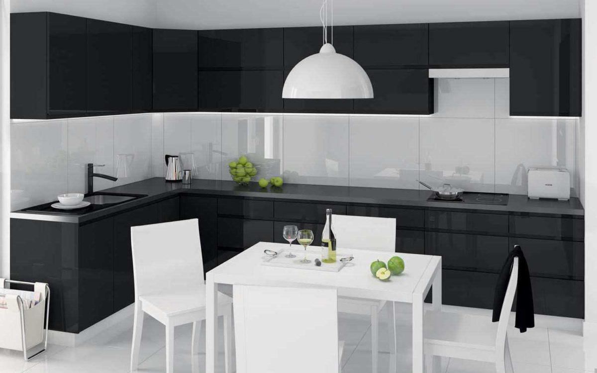 Наиболее стильным получается светлый интерьер с черной глянцевой поверхностью столешницы. Зеркальное отражение всех предметов зрительно увеличивает объем комнаты, придает интерьеру глубину.