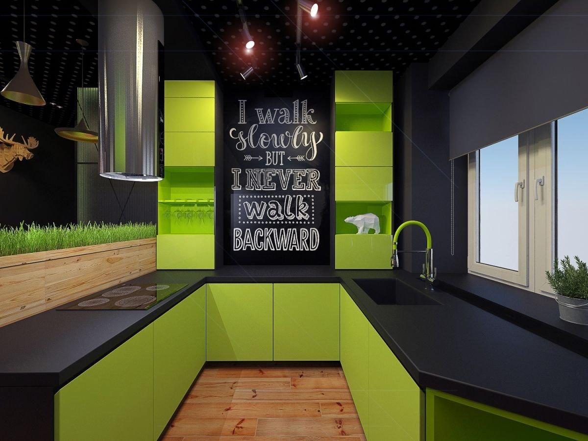 Если основным тоном вы планируете сделать черный, то интерьер придется продумать максимально тщательно. Например, для кухни в хрущевке это не лучшая идея – нужно просторное помещение. Рекомендуем хотя бы одну поверхность сделать полностью белой – в этом случае потолок.