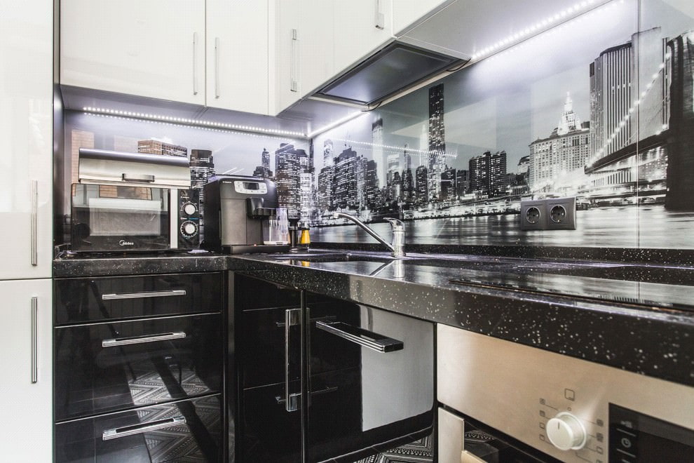 Обыграть контрастность базовых цветов поможет технологичный стиль. Лаконичный интерьер с глянцевыми фасадами, темной рабочей зоной и стеклом в оформлении фартука. Чтобы дизайн не напоминал минимализм, используют камень, принты с объемным эффектом и необычную фурнитуру. Светодиодная подсветка подчеркивает ниши, шкафы и напольные модули.