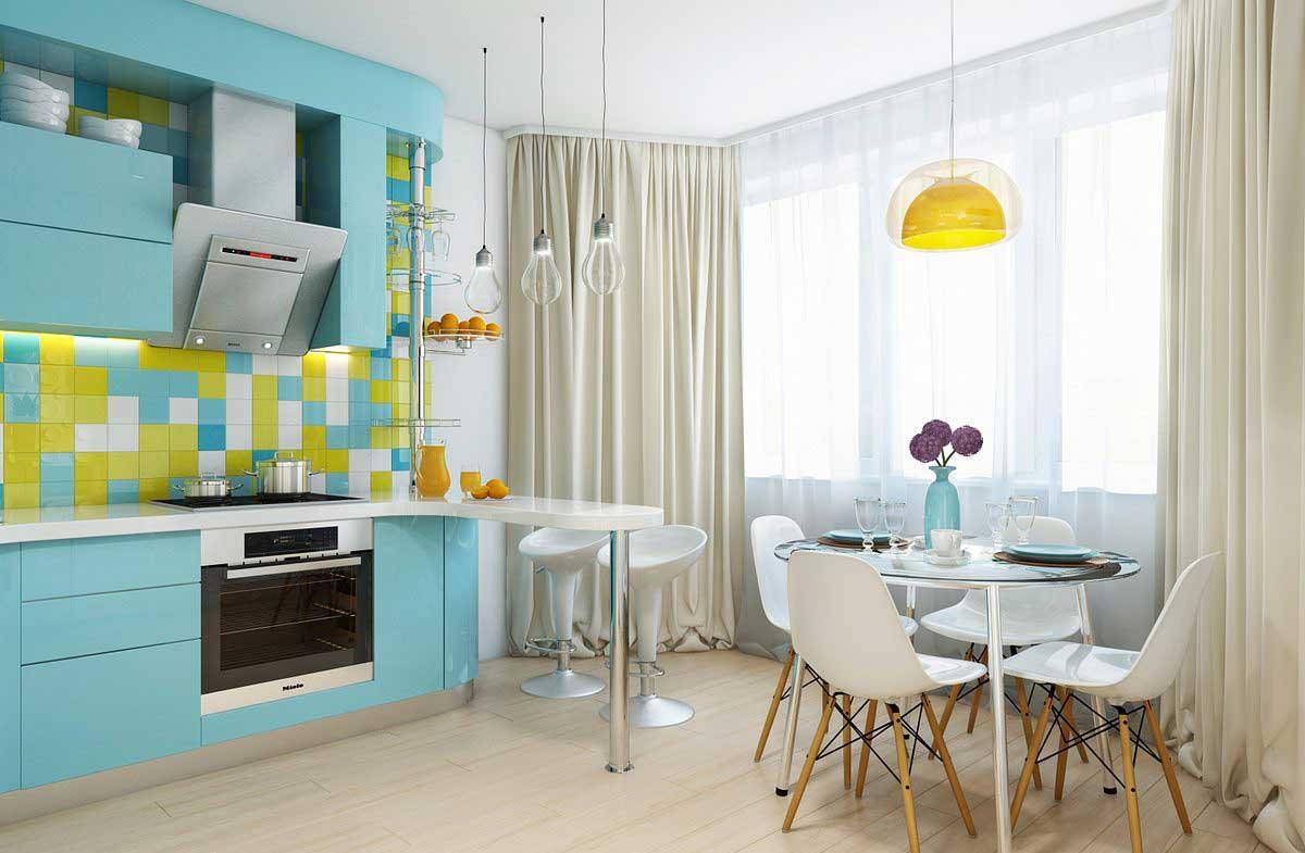 Чтобы помещение не напоминало стерильную операционную или лабораторию, к нему необходимо добавить несколько ярких цветовых оттенков. Например, украсить окна голубыми занавесками, обустроить фартук в голубых тонах, установить голубые стулья и обеденный стол.