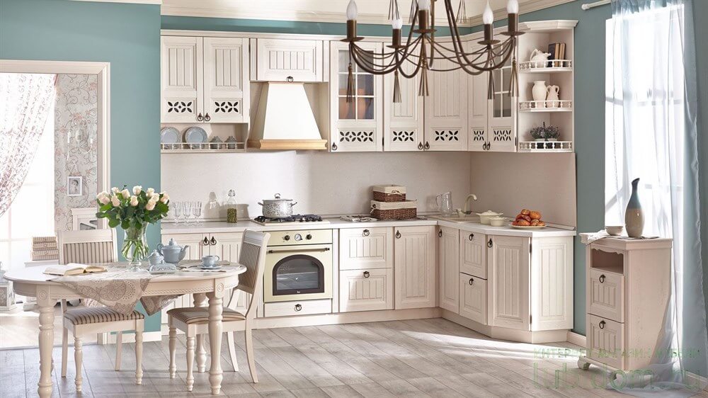 Прованс любит большое количество текстиля с растительным узором. Цвета преобладают спокойные: мятные, бежевые, оливковые оттенки. Полки открытые — на них выставлена глиняная или керамическая посудами с рисунками.