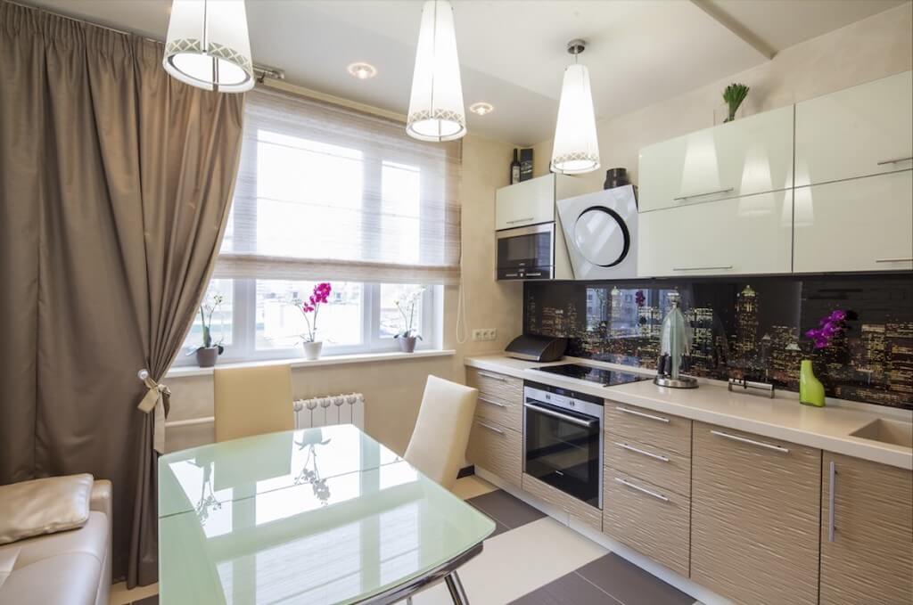 Этот стиль прекрасно подойдет даже для маленьких помещений, поэтому на 11-метровой кухне его можно использовать без опаски. Светлые тона отделки и гарнитура дополнительно расширят пространство. Стиль требует хорошего освещения — обычно для этого используют точечные светильники по всему потолку.