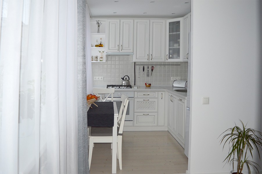 - вместо балки можно использовать ламбрекен из ткани, одинаковой с оконными занавесками и остальным текстилем, закрепленный на потолке на линии разделения кухни и гостиной;