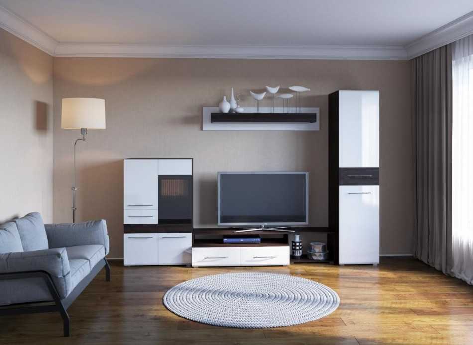 Если ТВ-приемник не прикреплен к стене, необходимо обзавестись подставкой под телевизор. В домах, где принято часто встречать гостей, не обойтись без мебели для хранения посуды. Для минималистичной гостиной идеально подойдут компактные модульные стенки и стеллажи.