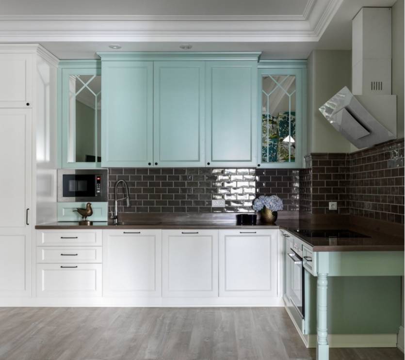 Кухня в стиле неоклассика, как видно на следующих фото, предполагает полёт фантазии на тему использования естественных оттенков. Поэтому комбинировать можно в следующих вариантах: