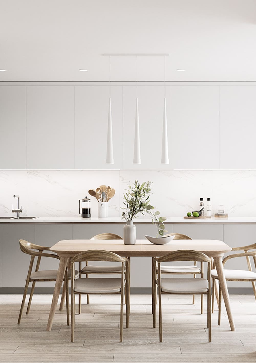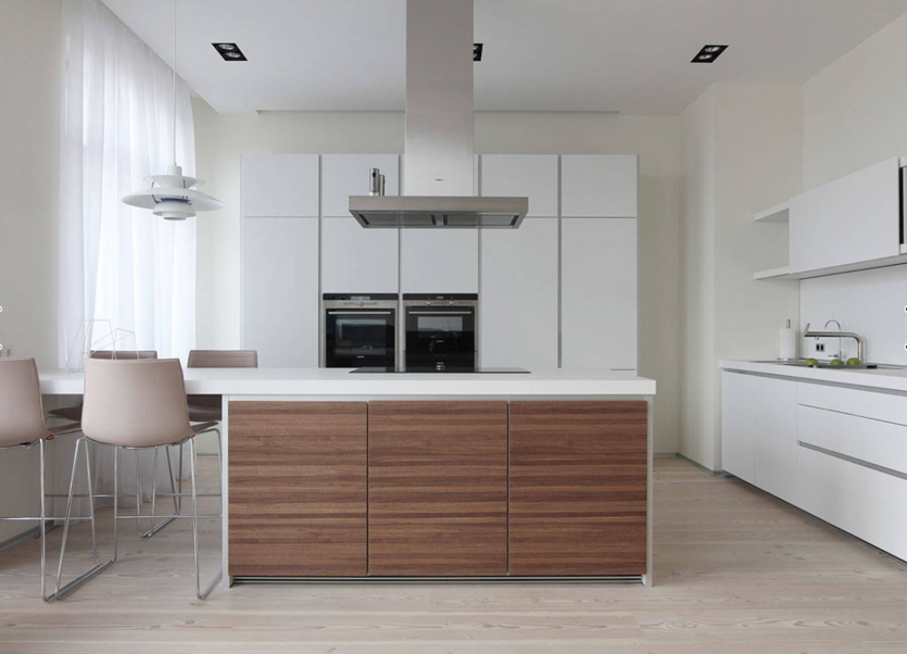 Натуральные деревянные поверхности не дадут кухне стать слишком холодно-минималистичной. Это могут быть стол, столешница, напольное покрытие или даже отделка фрагмента стены. Уместным будет повесить деревянную утварь на стены на крючках.