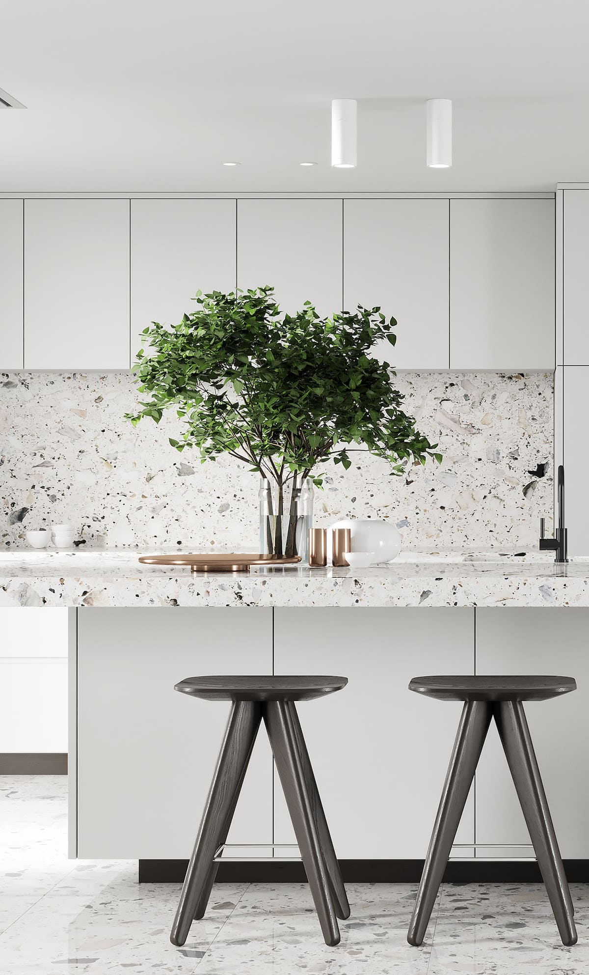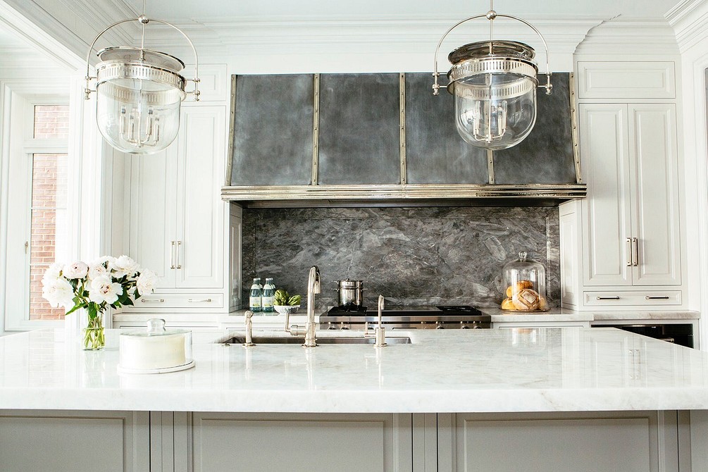 С ним гармонично смотрится мраморная отделка, кирпичная кладка, поверхность камня, металлические ручки и держатели, белый глянец. Серая палитра – это современная альтернатива бежевой классике.