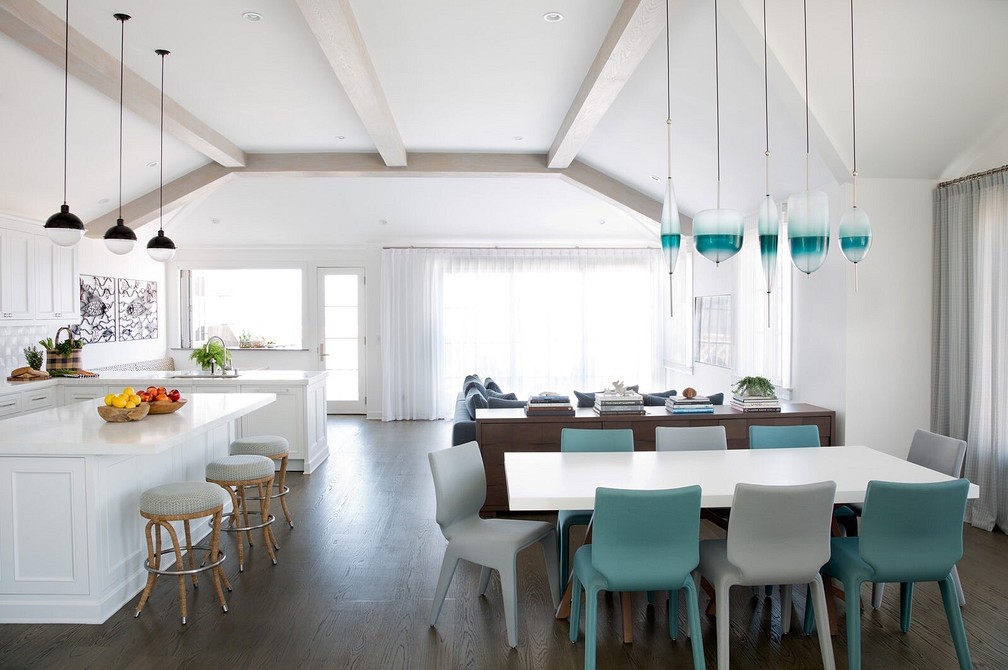 Стильные металлические лампы над столом подарят много теплого света за ужином