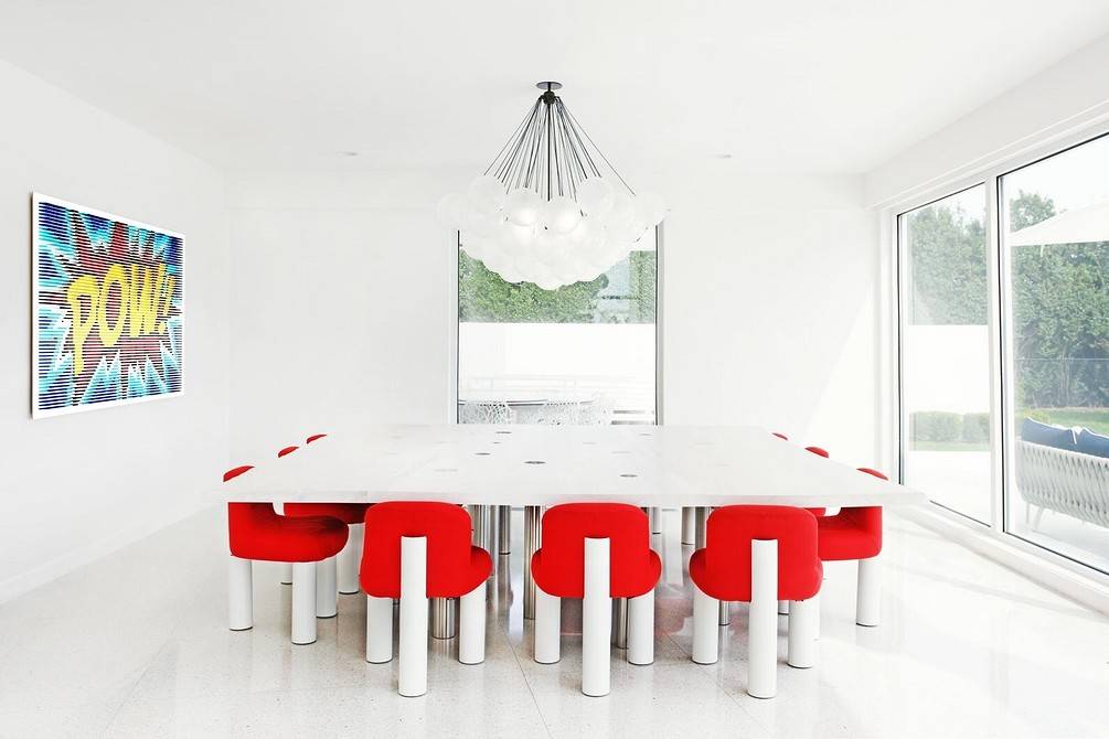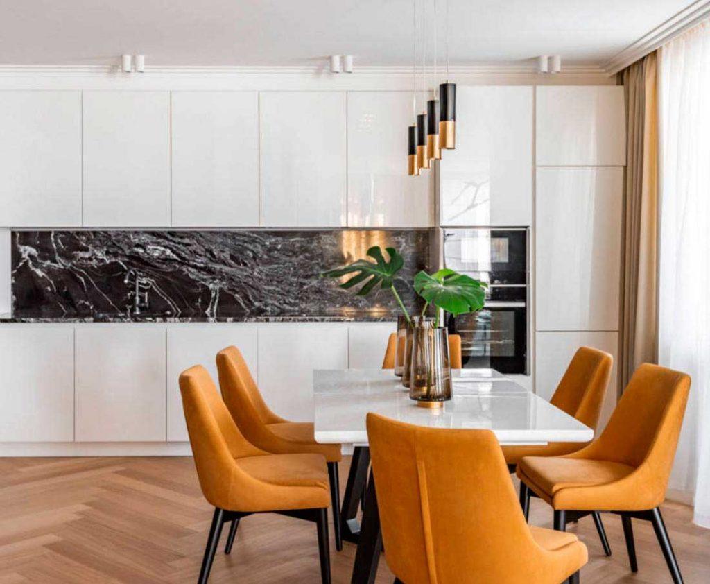 Стильно и в то же время классически выглядит обеденный стол из того же материала, что рабочая столешница. А вот в просторной комнате с четким зонированием можно наоборот сыграть на контрасте. Например, взять под белоснежный камень темное дерево или стекло