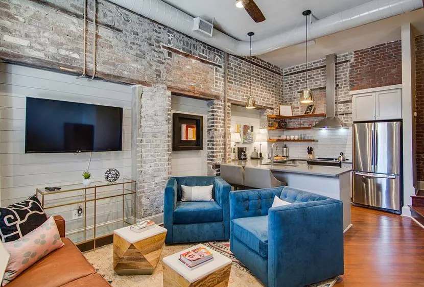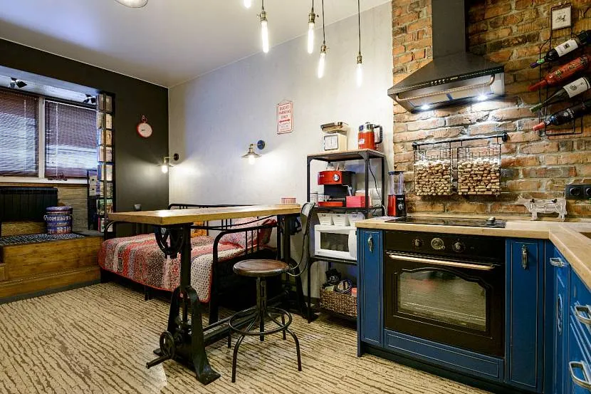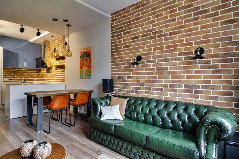 Современные комнаты в квартирах оформляют в стиле лофт. В помещении присутствуют стены из неприкрытого кирпича или бетона в комбинации с пластиковыми элементами и стеклянными осветительными приборами. На полу отлично смотрятся деревянные доски или бетонные плиты. В индустриальном интерьере оставляют открытые коммуникации, провода и трубы. Кухню объединенную с гостиной обставляют деревянной меблировкой с грубой фактурой, украшают медным, латунным и кожаным декором.