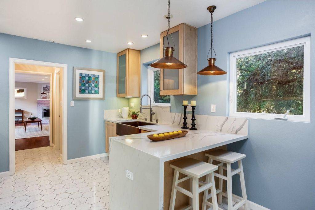 Для того чтобы отделить обеденную зону от рабочих поверхностей, дизайнеры советуют применить прем зонирования.