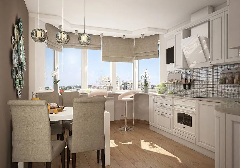 Самый простой и удобный вариант – установка обеденного стола под кухонным окном. Естественный свет полезен для здоровья, создает уютную домашнюю атмосферу. Стол может быть отдельно стоящим ими быть частью кухонного гарнитура. Используют барные стойки и выдвижные конструкции. Перед панорамными окнами на кухне отлично смотрится высокая барная стойка со стульями, особенно если за стеклом открывается вид на город. Складные стулья сэкономят свободное место. Если площади достаточно, подходит полноценная обеденная группа.