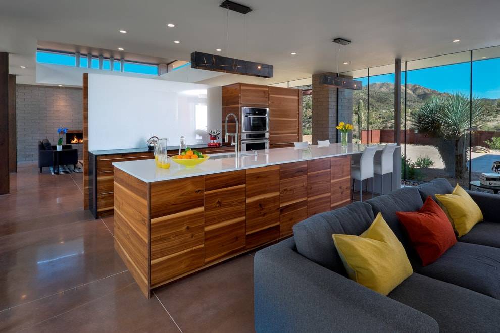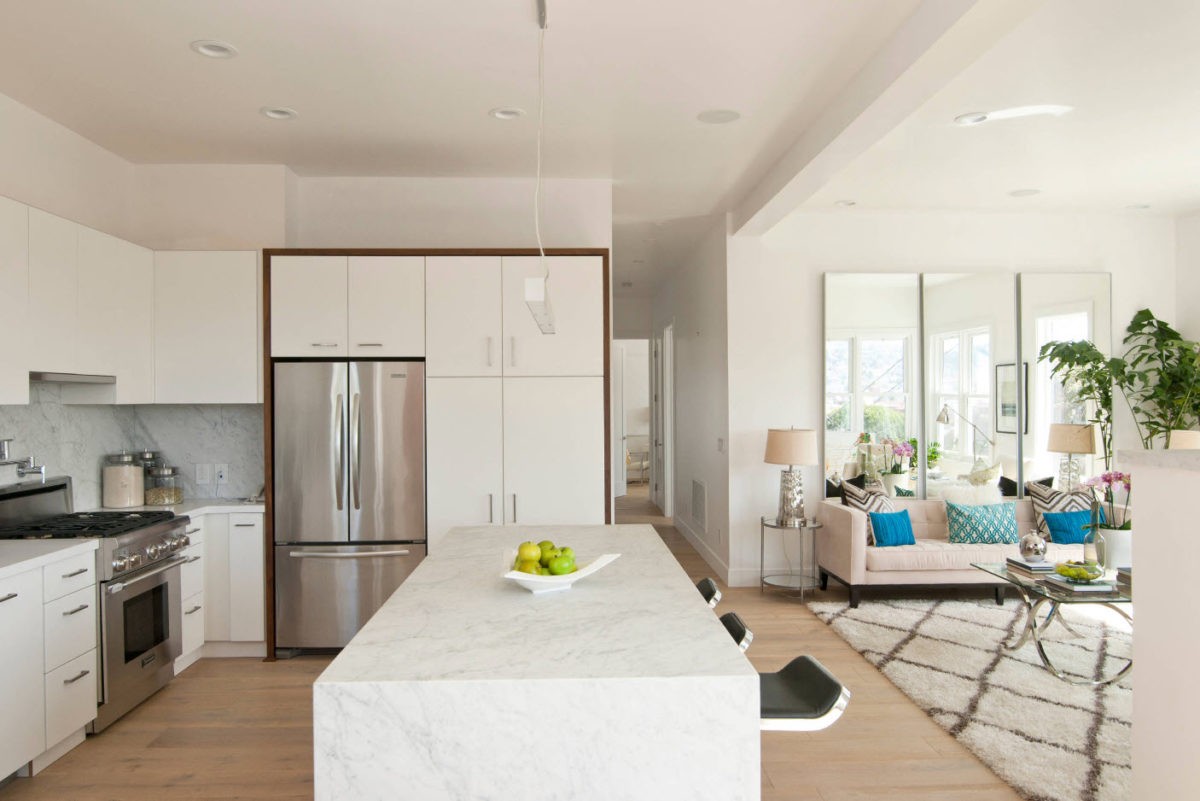 Отделить кухню от гостиной можно с использованием «кухонного острова».