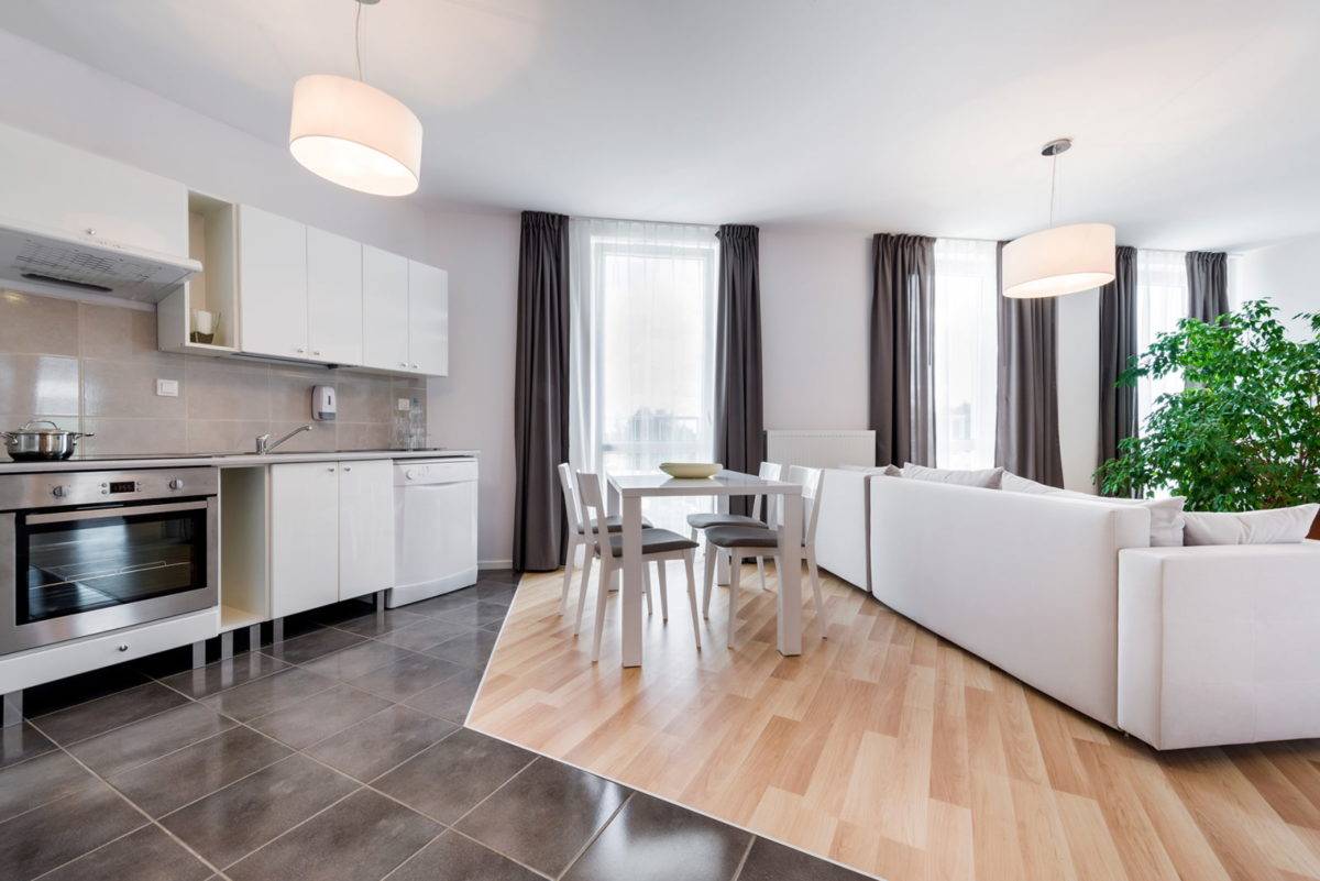 С помощью разного по цвету и фактуре напольного или стенового покрытия можно определить расположение зон, а также обыграть дизайн кухни-столовой-гостиной. Так, в кухонной части положить на пол керамогранит, а в гостиной-столовой – ламинат, либо паркетную доску. Это сделает деление территорий более наглядным.
