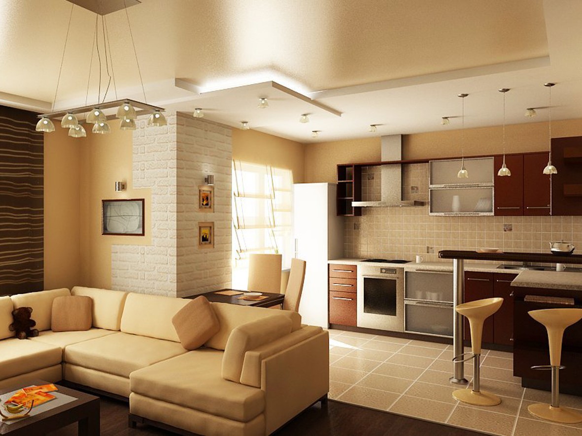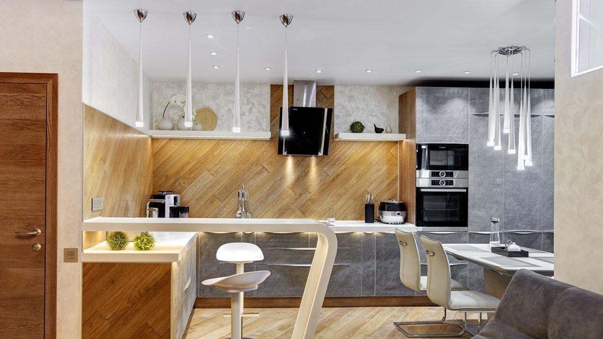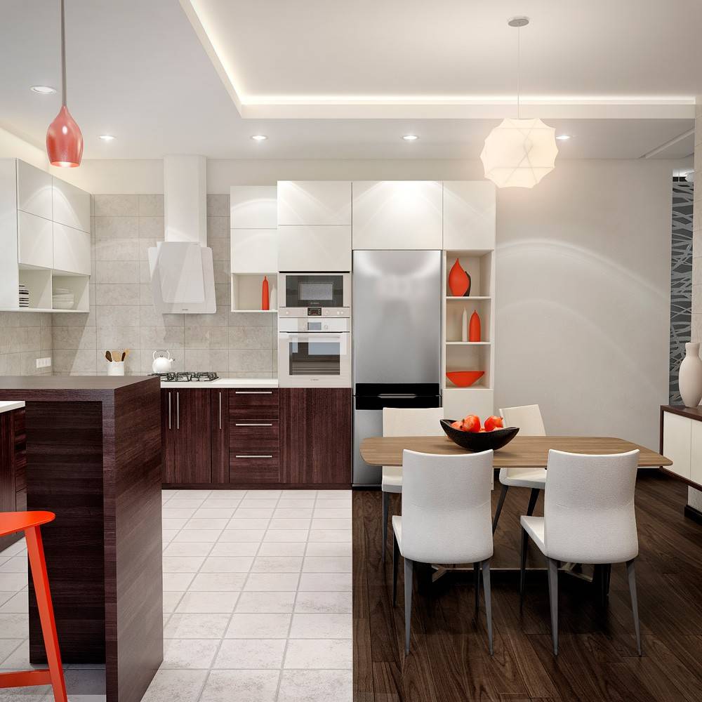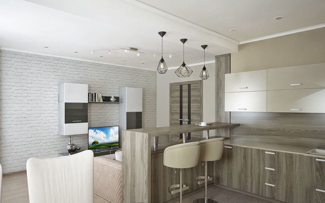 Дизайн кухни, совмещённой с залом, предполагает три основные точки подсветки: