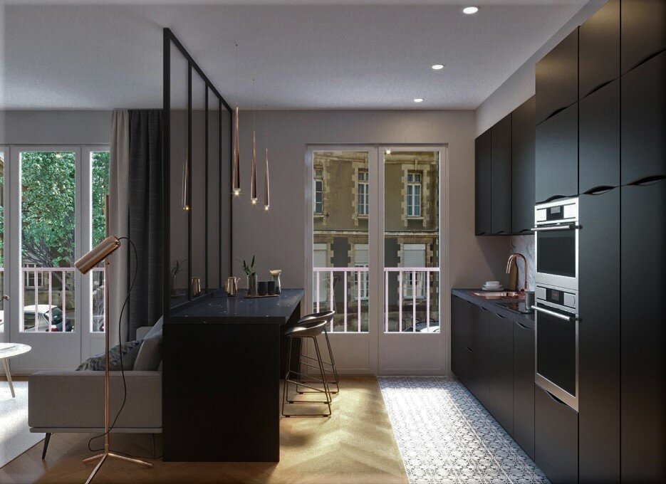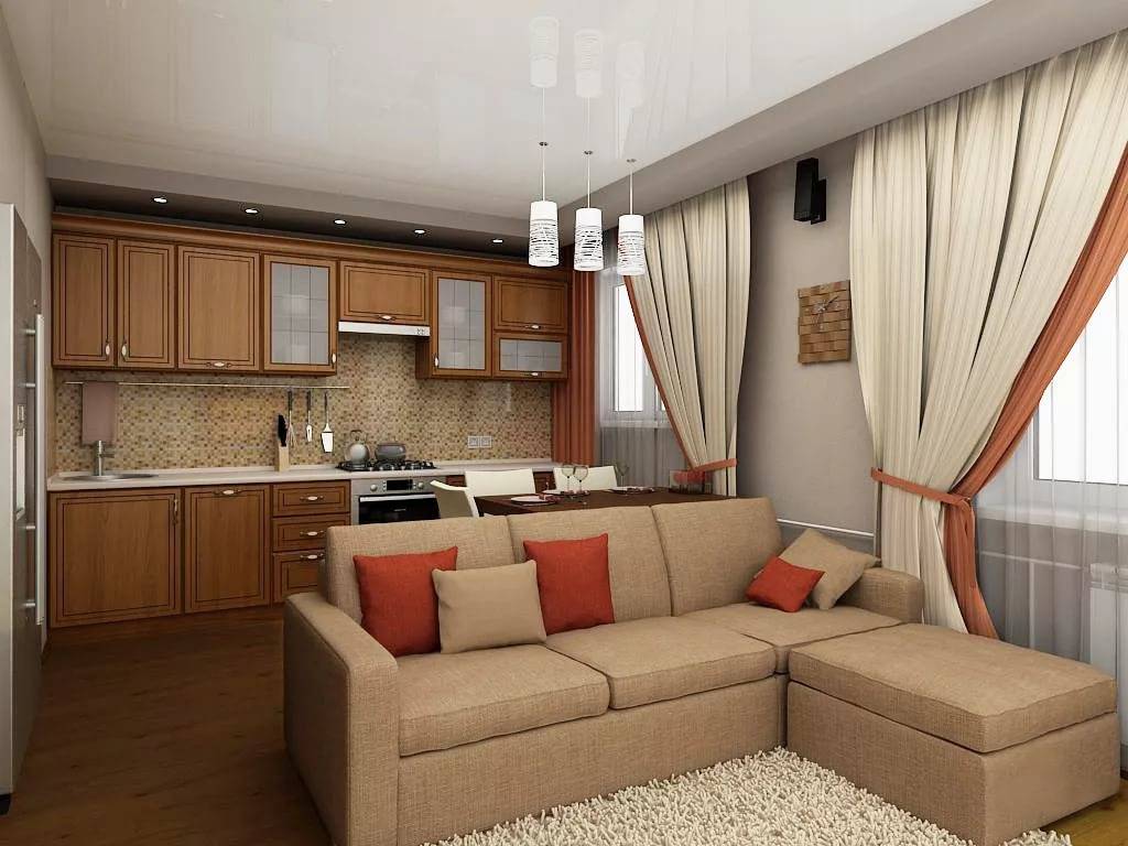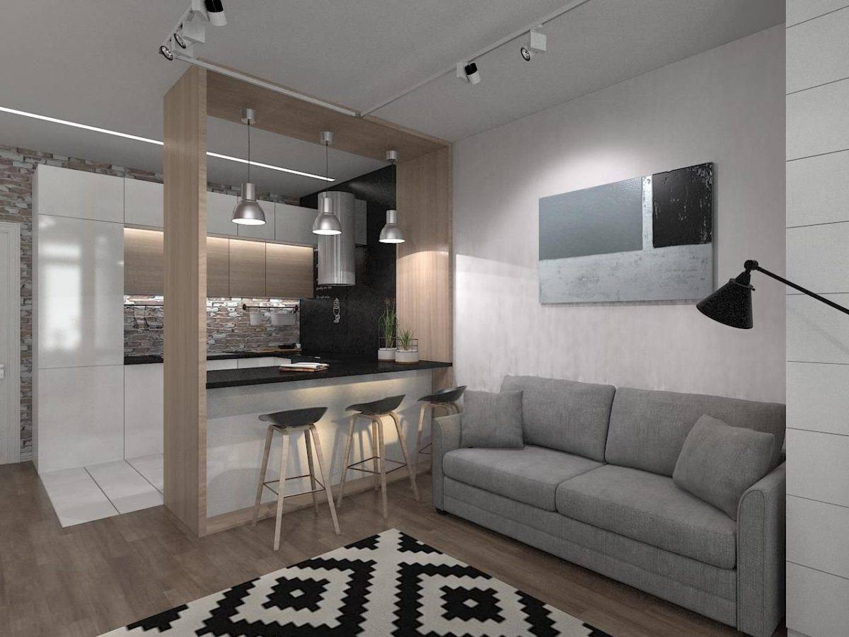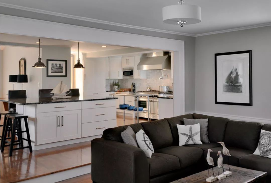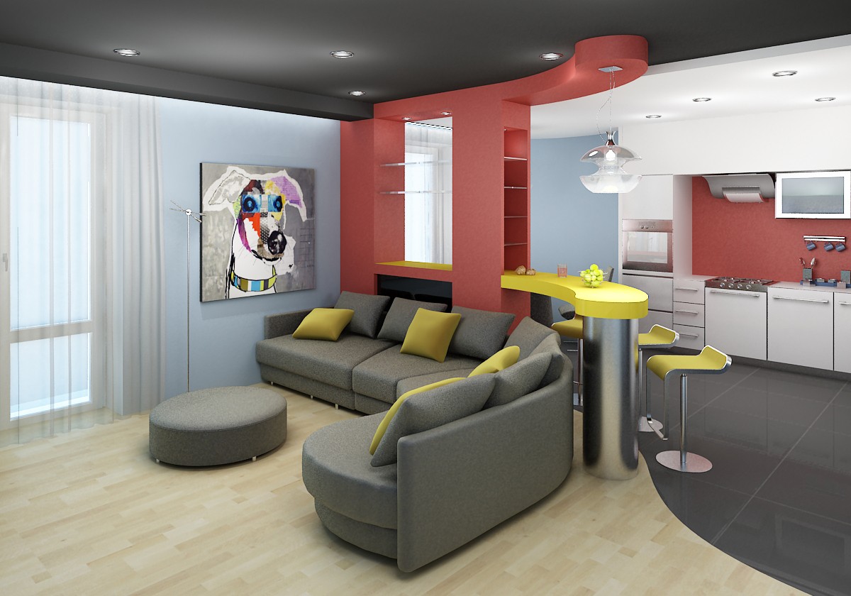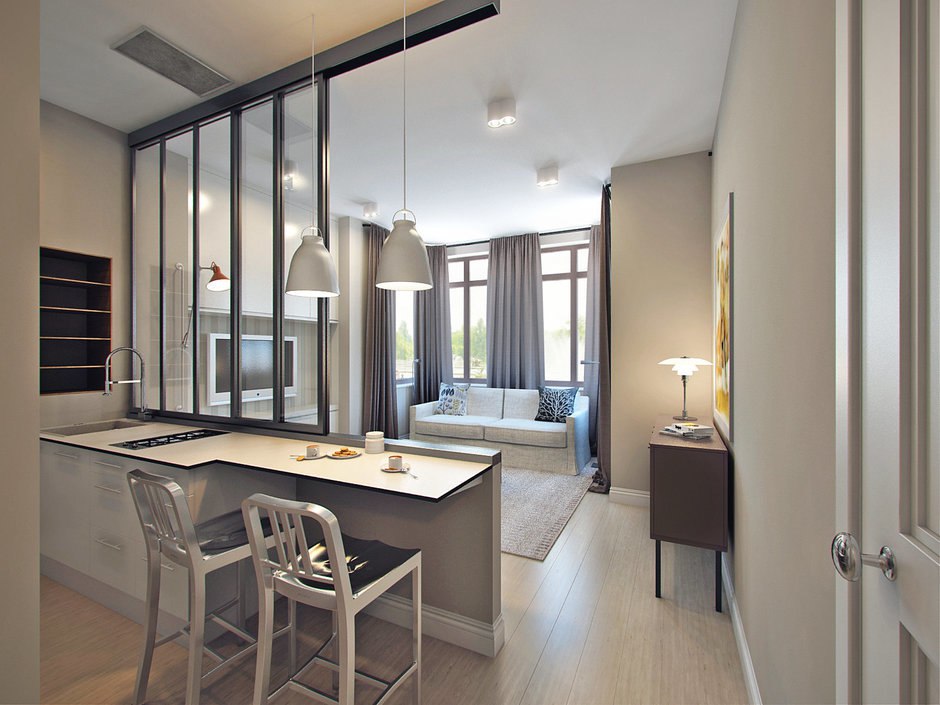 Если хозяин квартиры считает, что кухонное пространство всё-таки должно соответствовать устоявшимся требованиям и отрицает радикальное вмешательство в планировку, то зонирование кухни и гостиной реально выполнить, оставив между ними немного стены-перегородки.