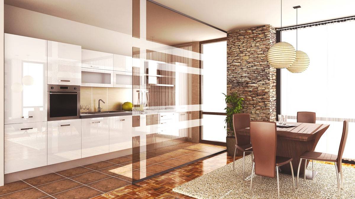 Для полов выбирайте такое покрытие, которое выдержит падение острых и тяжелых предметов. Такими материалами является кафель и ламинат с водостойким покрытием. Преобразуйте стены по своему желанию. Благодаря отделке стен кухню можно разделить на отдельные зоны, например, рабочую и обеденную. В дизайне интерьера использование непривычных материалов и контрастных цветов только приветствуется. Не бойтесь экспериментировать.