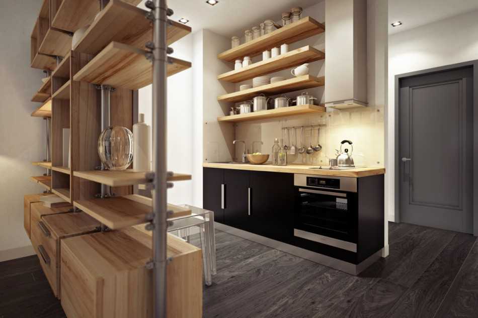 Открытые полки с выставленной посудой и остальное из этой оперы — пылесборники. Может получиться и круто, но есть более рациональные пути.