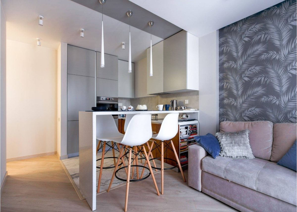 Зонирование барной стойкой – современный лайфхак, он несколько лет остаётся в тренде. Сегодня пользуются спросом «невесомые» барные стойки. Такой эффект достигается сокращением барных опор до одной. В идеале – опору можно сделать из прозрачного плексигласа.