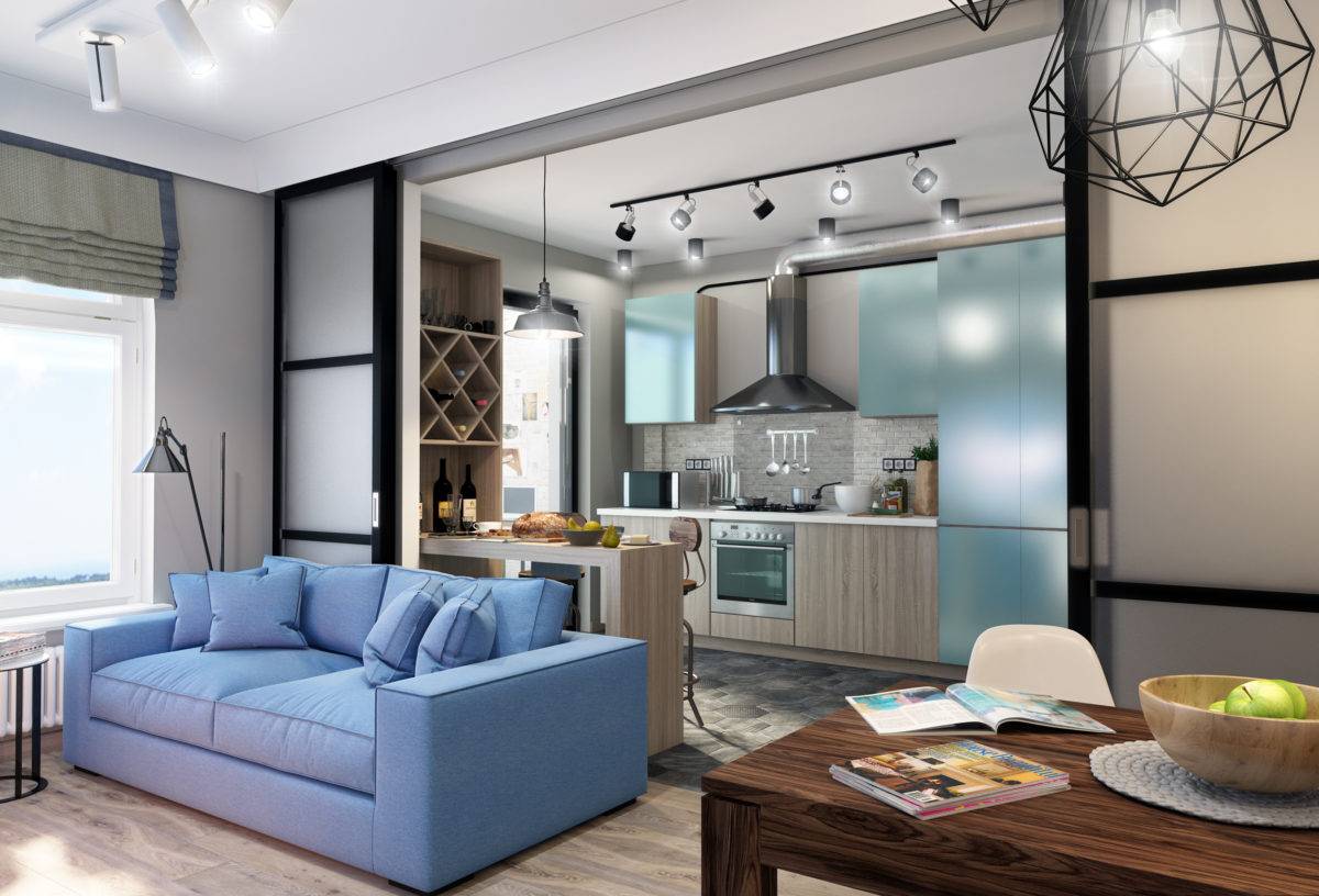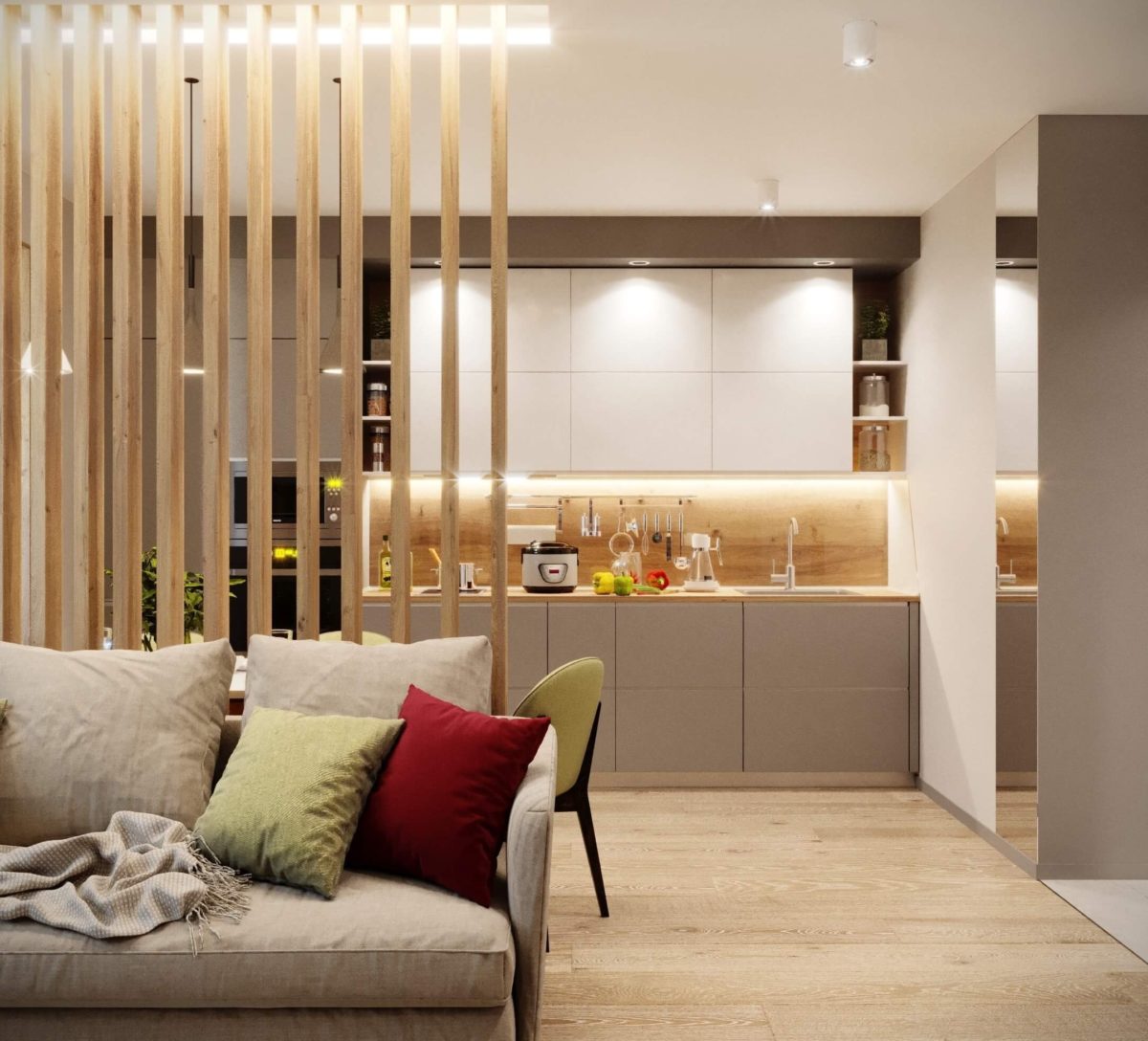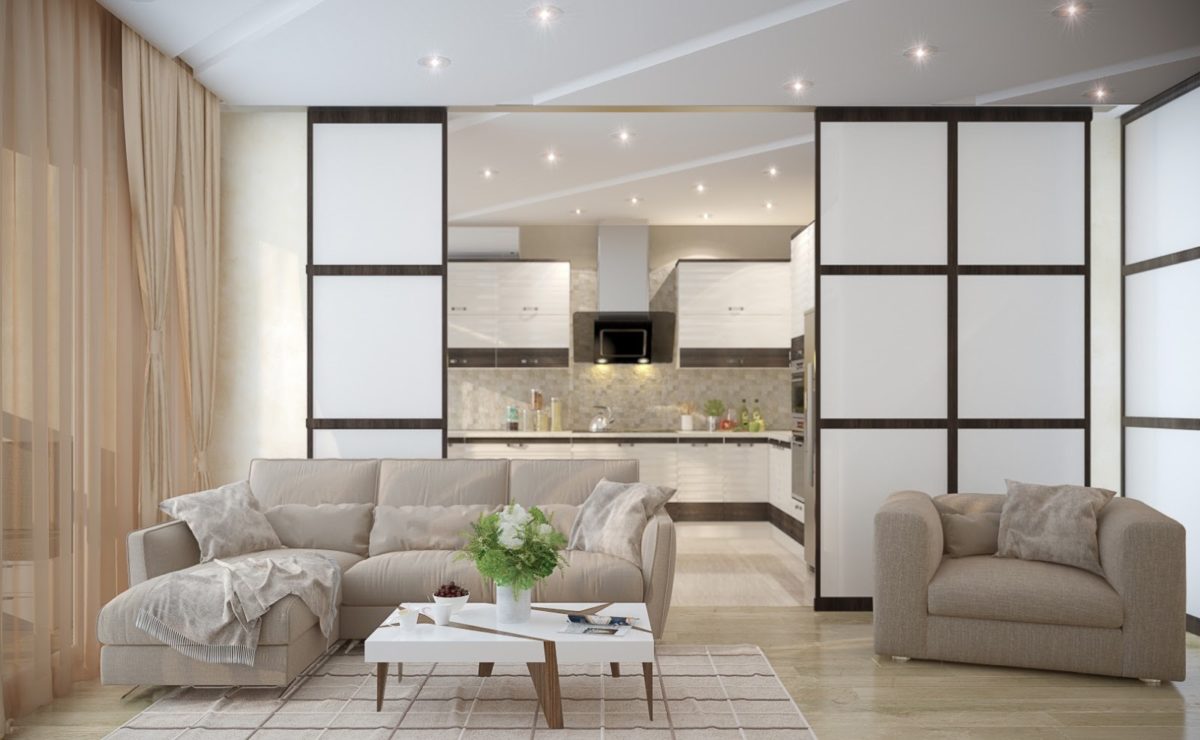 Также между перегородкой и стеной можно установить раздвижные двери и получить в финале «два в одном» — либо кухню, совмещённую с залом, либо два разделённых дверью помещения.