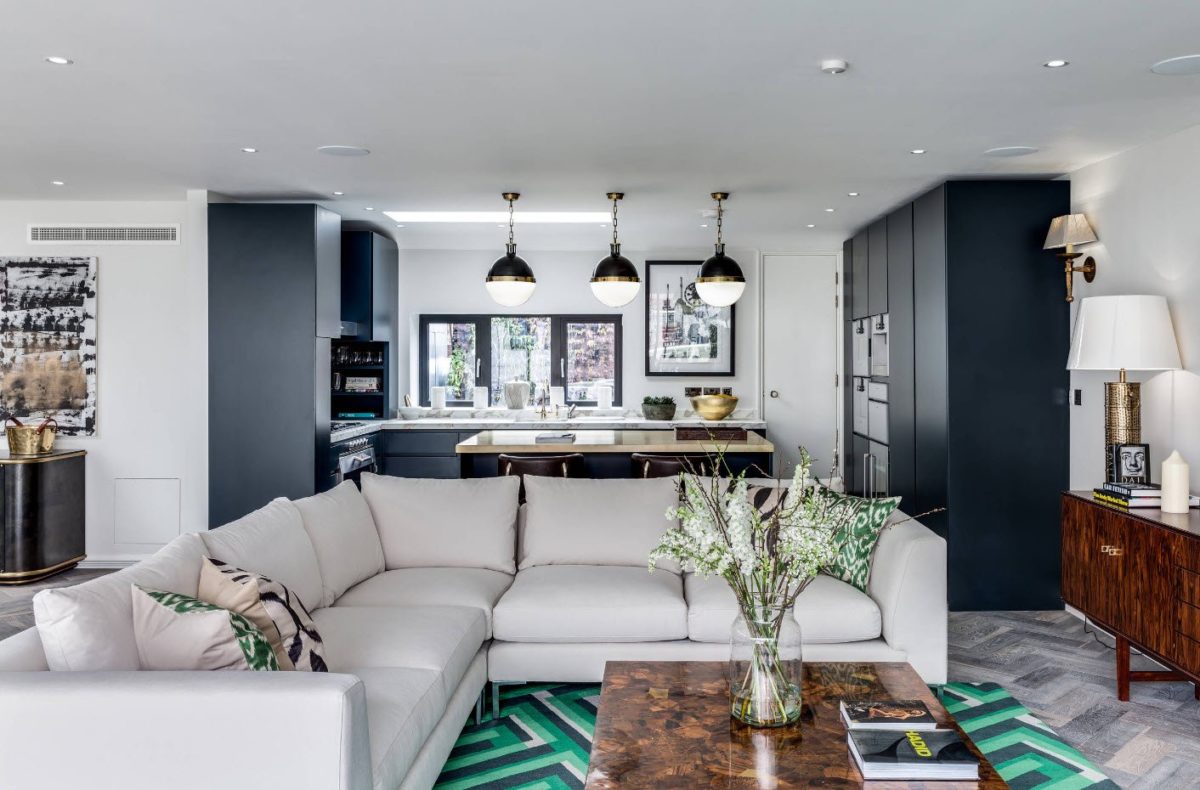 Правильное расположение световых точек поможет подчеркнуть значимые зоны и углубить места для отдыха. Например, ланч-территорию в современном дизайне кухни-гостиной обозначит «местное» освещение – светильники располагают по периметру стола.