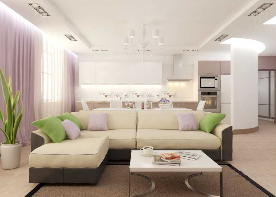 Часто дизайнеры интерьеров применяют для зонирования разные типы освещения. Пространство кухни всегда должно иметь максимальное количество света, для удобства и безопасности. В зоне отдыха достаточно нескольких точек, торшеров или бра. В месте приема гостей желательно включать верхний свет.