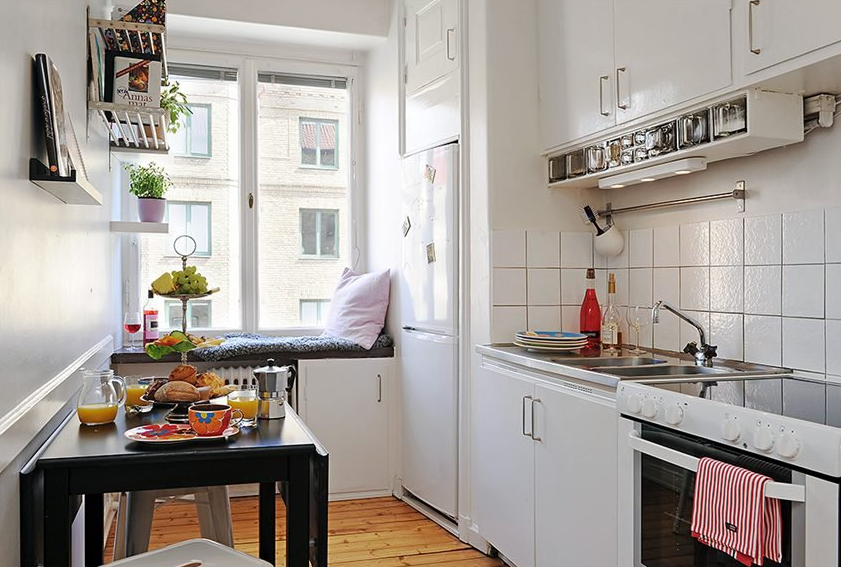 Кухонный гарнитур дизайнеры рекомендуют ставить вдоль одной стены, а обеденный стол — на противоположной или вдоль окна. Как вариант, обеденный стол можно расположить в гостиной, освободив место в кухонной зоне.
