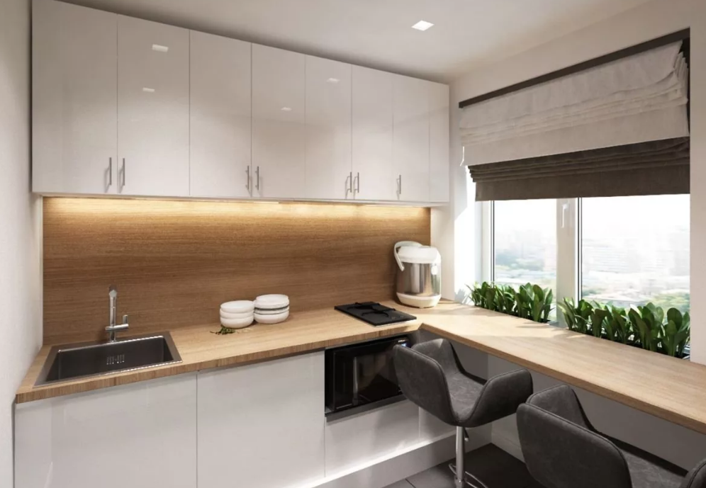 В тесных квадратных кухнях удобно размещать рабочий стол на подоконнике.
