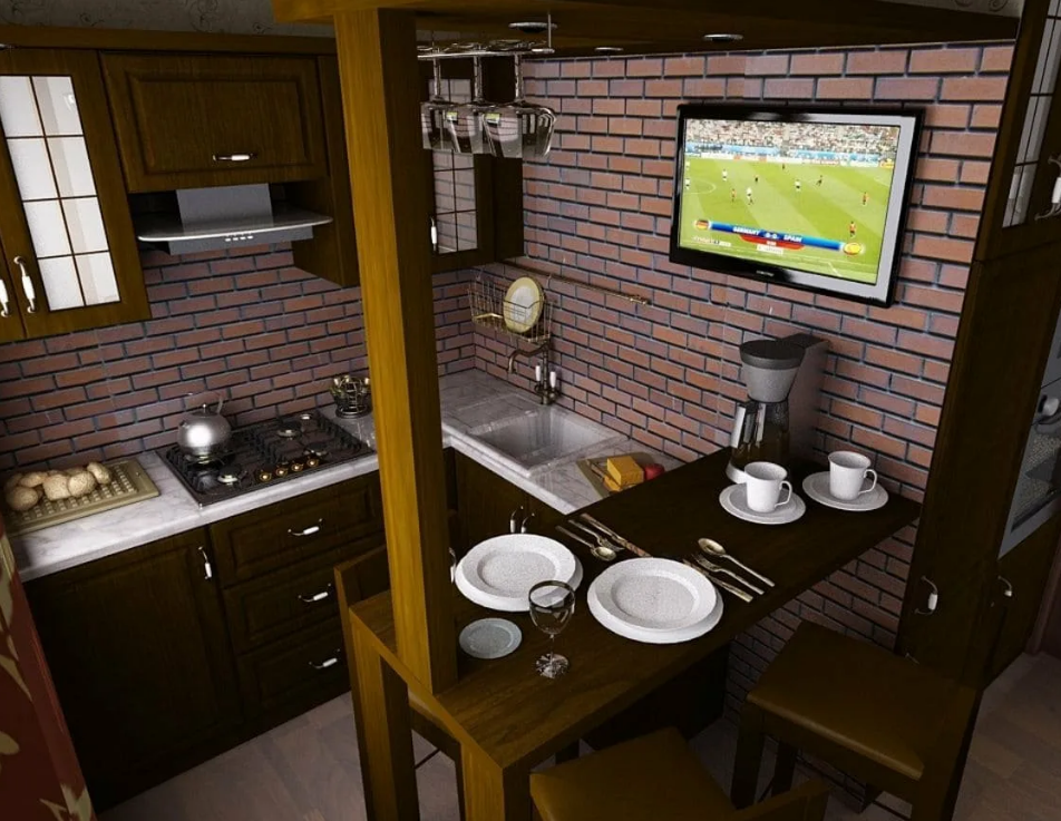 - Для стандартных кухонь на 9 квадратных метров подойдет экран размером не более 20 дюймов.