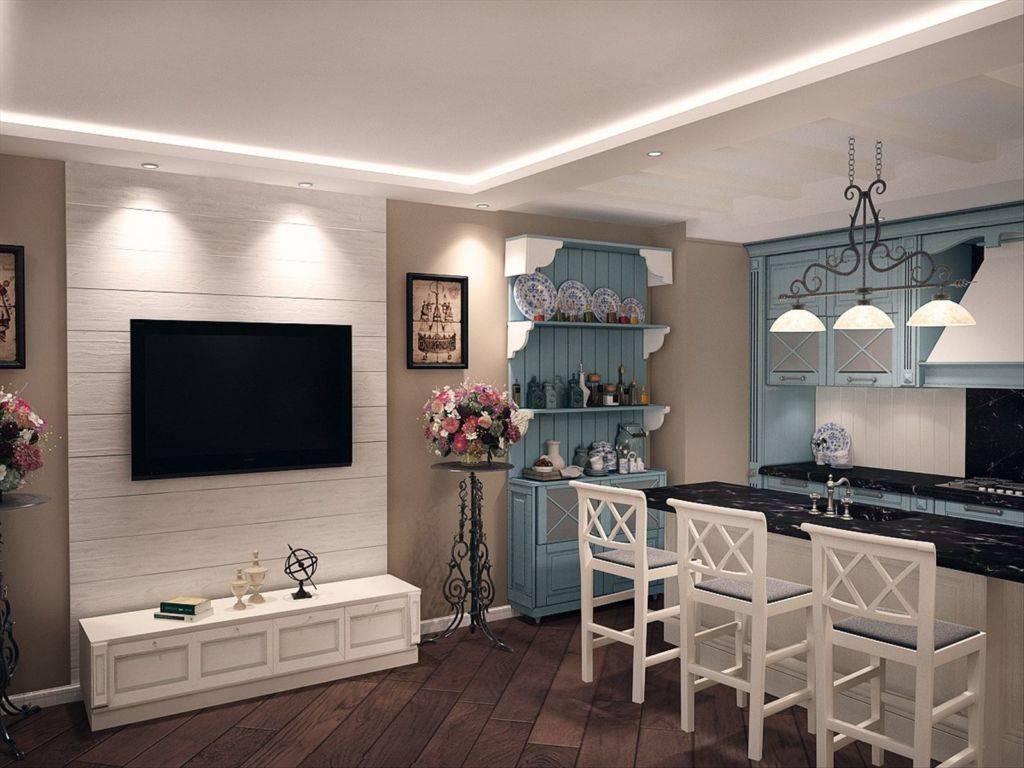 Если позволяет высота помещения, сделайте двухъярусный подвесной потолок овальной формы со встроенной подсветкой. Он зрительно объединит кухню и гостиную. То же самое касается и стен. Цветные полосы, плавно перетекающие плавные линии создадут ощущение завершенности и целостности. Что касается выбора стиля, то здесь будет уместно сочетание классики и модерна, а также прованса и рококо.