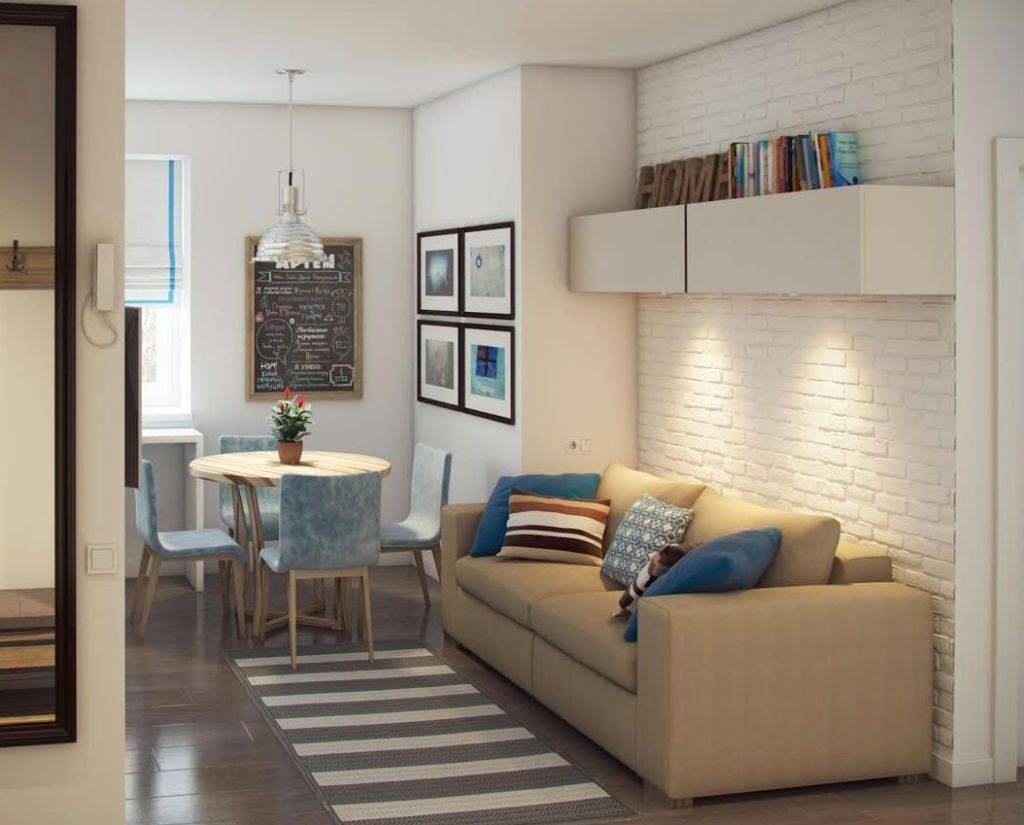 Оригинальный интерьер кухни-гостиной 14 кв. метров с зонированием, благодаря перегородке