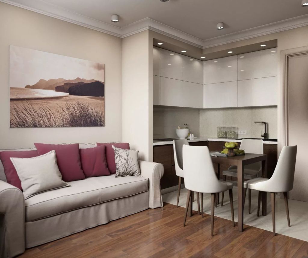 Независимо от того, какому стилю отдается предпочтение, важно, чтобы кухню и гостиную на 14 квадратах объединяли различные элементы дизайна. Резкий контраст оттенков не сможет дать полной гармонии, поэтому рекомендуется выбирать нейтральные пастельные цвета: персиковый, белый, серый, бежевый, розовый и т.д
