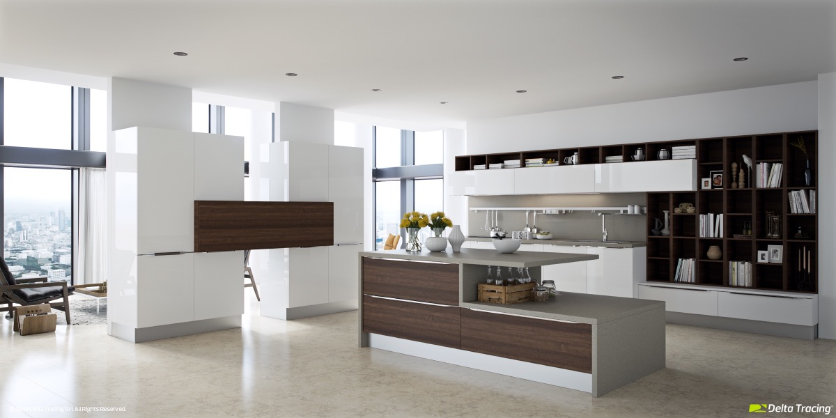 Остров с белой глянцевой поверхностью отделяет кухню от гостиной