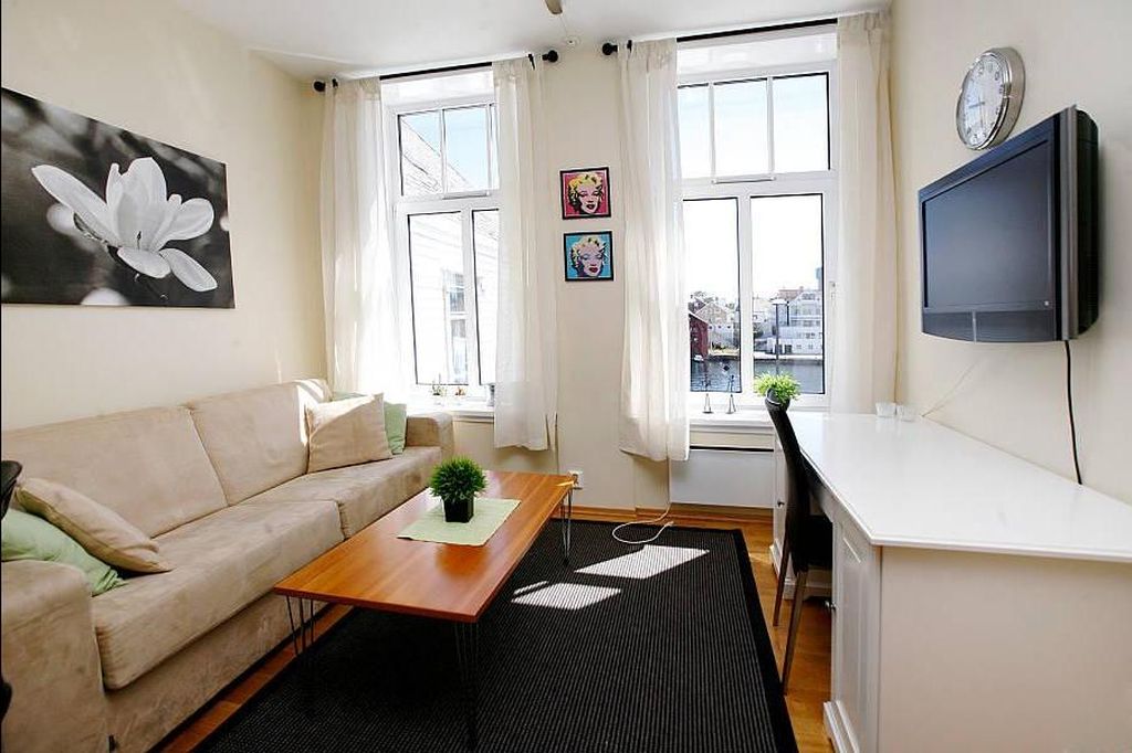 В крохотном помещении можно создать потрясающий интерьер, как в этой симпатичной комнатке. Гостиная, включает все необходимое: вместительный диван, столик, ТВ-зону с секцией. Дополняют стильный дизайн подвесные потолки и модные фотообои.