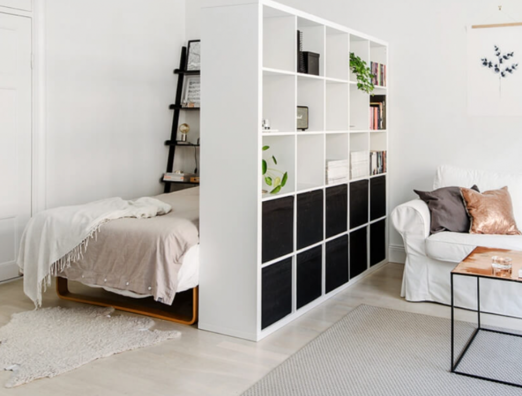 Для полноценного зонирования однокомнатной квартиры используй двусторонние стеллажи или шкафы с раздвижными дверями, по типу купе. Доступ с двух сторон сделает конструкцию практичнее и визуально легче.