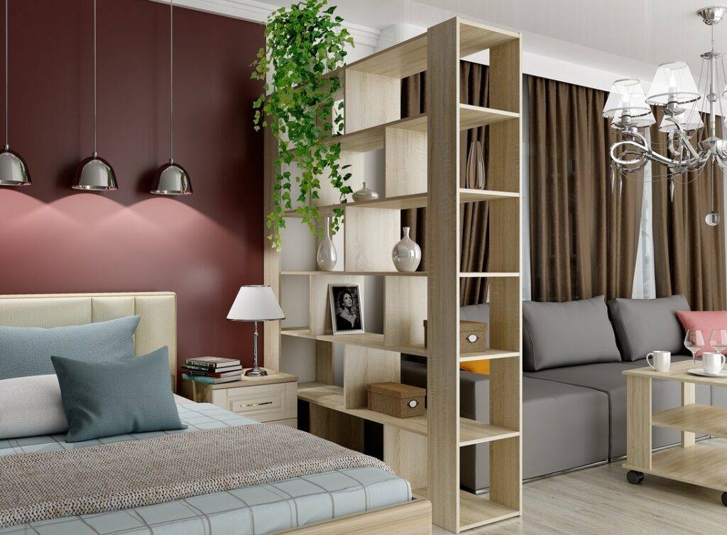 Использование вместо перегородки шкафов и стеллажей – отличное решение для просторной комнаты или вытянутого помещения, которое нужно визуально сбалансировать, оставив практически свободными длинные стены. Самый простой и недорогой вариант – открытый или полуоткрытый стеллаж с неглубокими ячейками. При этом рабочая часть полок может быть расположена как в гостиной зоне, так и со стороны спального места, чтобы перегородка была наиболее функциональной. Если стеллаж закрытый, лучше делать его не слишком высоким, чтобы не создавать эффект нагроможденности.