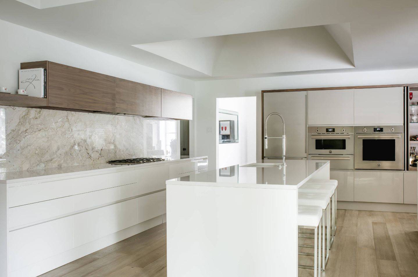 Плюсы: Полуостров – это модуль, который торцом упирается в стену или является продолжением гарнитура. В него можно встроить технику (плиту, холодильник, винный, шкаф) и/или использовать его как рабочее место и барную стойку. Полуостров делает кухню очень удобной и к тому же может разделить ее на зоны – рабочую и столовую или на кухонную и гостиную. При этом полуостров занимает меньше места, чем остров.