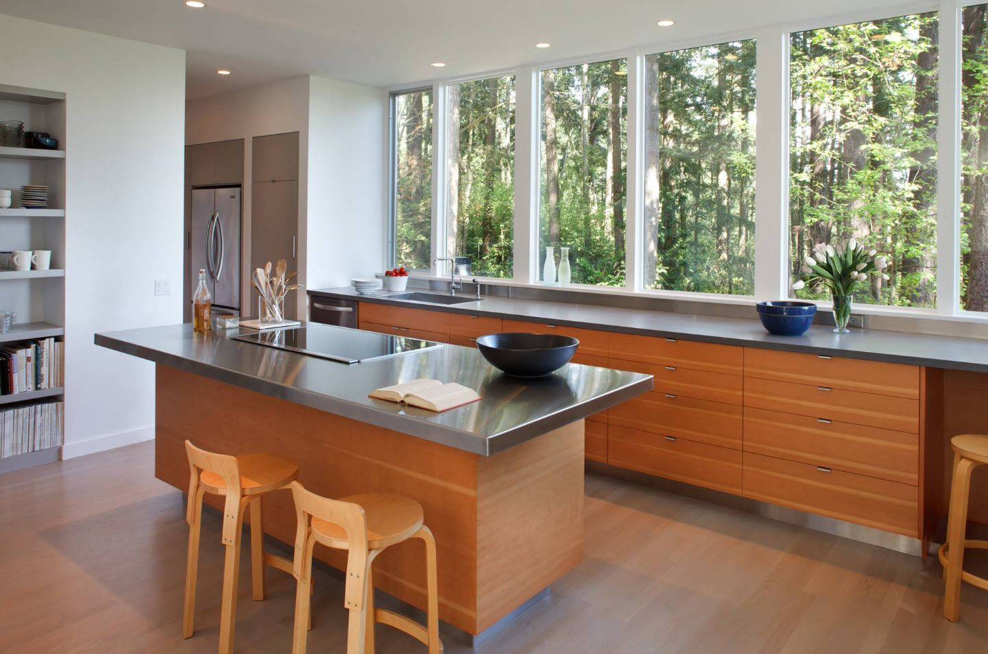 Линейная планировка вдоль одной стены очень удобна тем, что все находится рядом. А остальная часть кухни может содержать столовую зону.