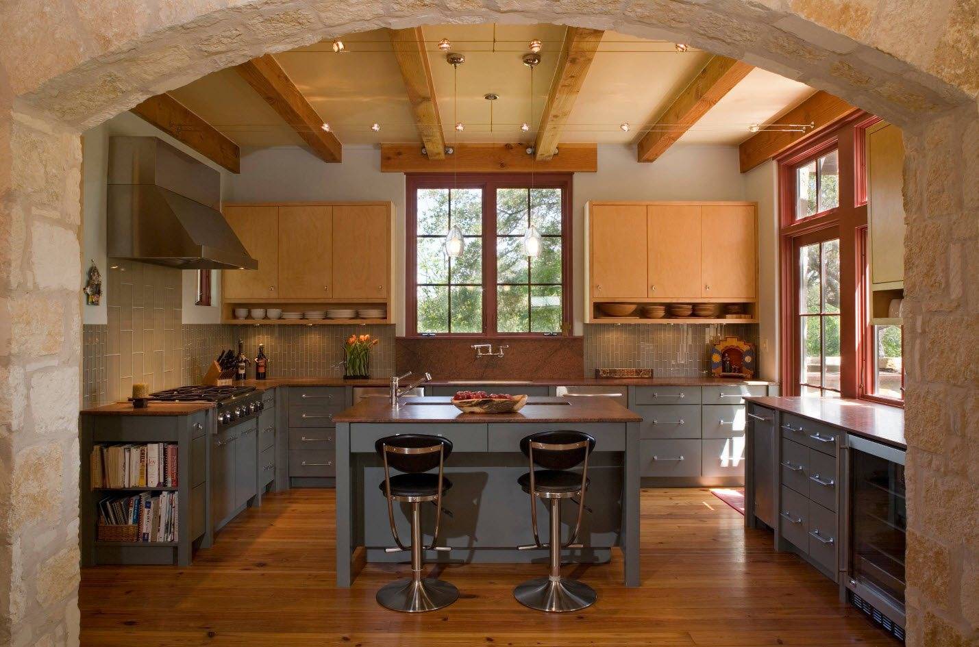 Выход не стоит заставлять лишними тяжелыми предметами, иначе создастся слишком загроможденная композиция. Между п-образными боковинами гарнитура следует оставлять ширину не менее 1,2 м. Чтобы сгладить острые углы, можно установить напольные шкафчики с полукруглыми дверцами. Обеденная область будет шикарно смотреться посередине комплекта, но при условии достаточно просторной атмосферы.