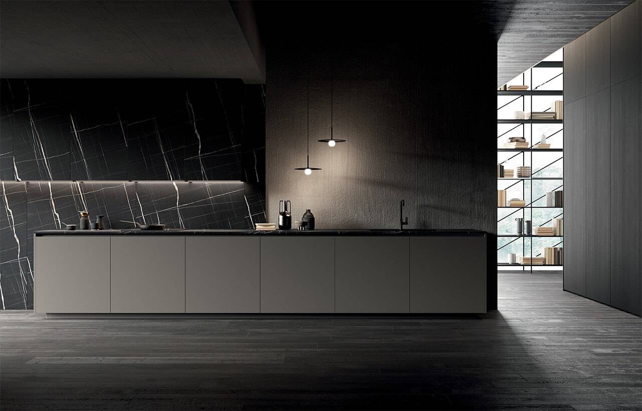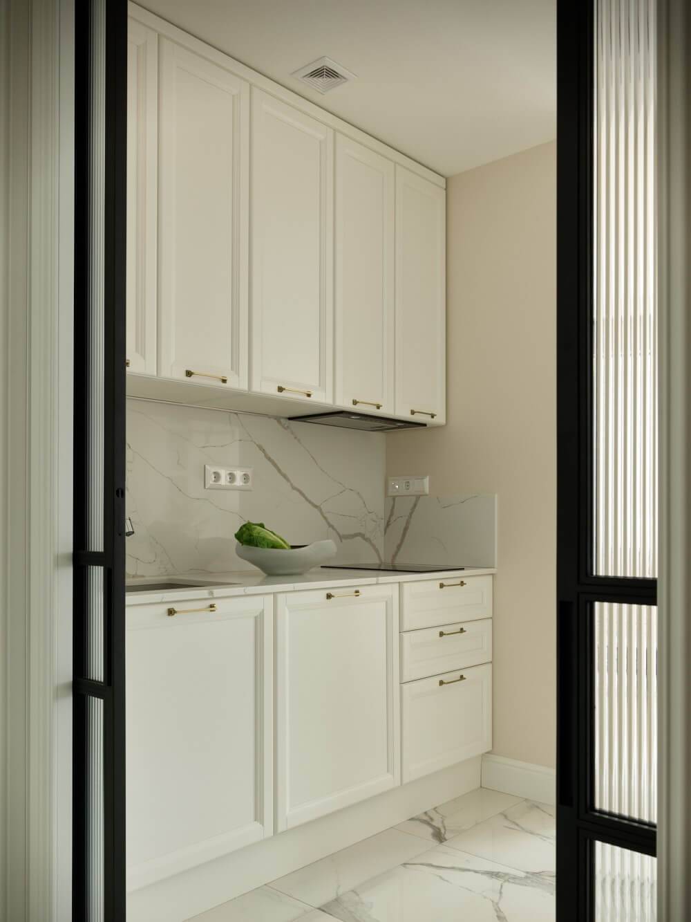 Мрамор в оформлении рабочей поверхности, фартука, стен и кухонных фасадов. Ernestomeda