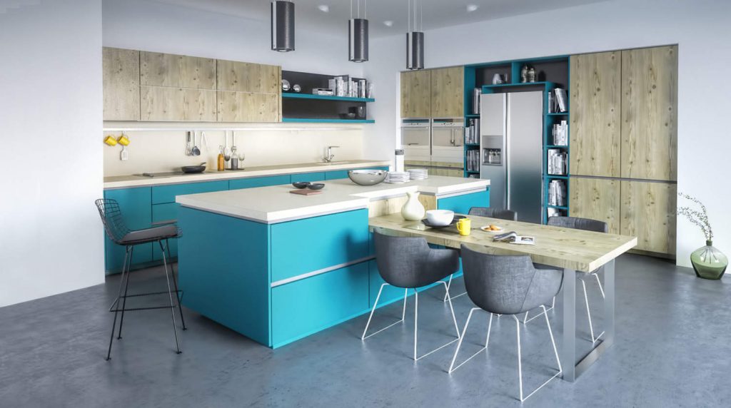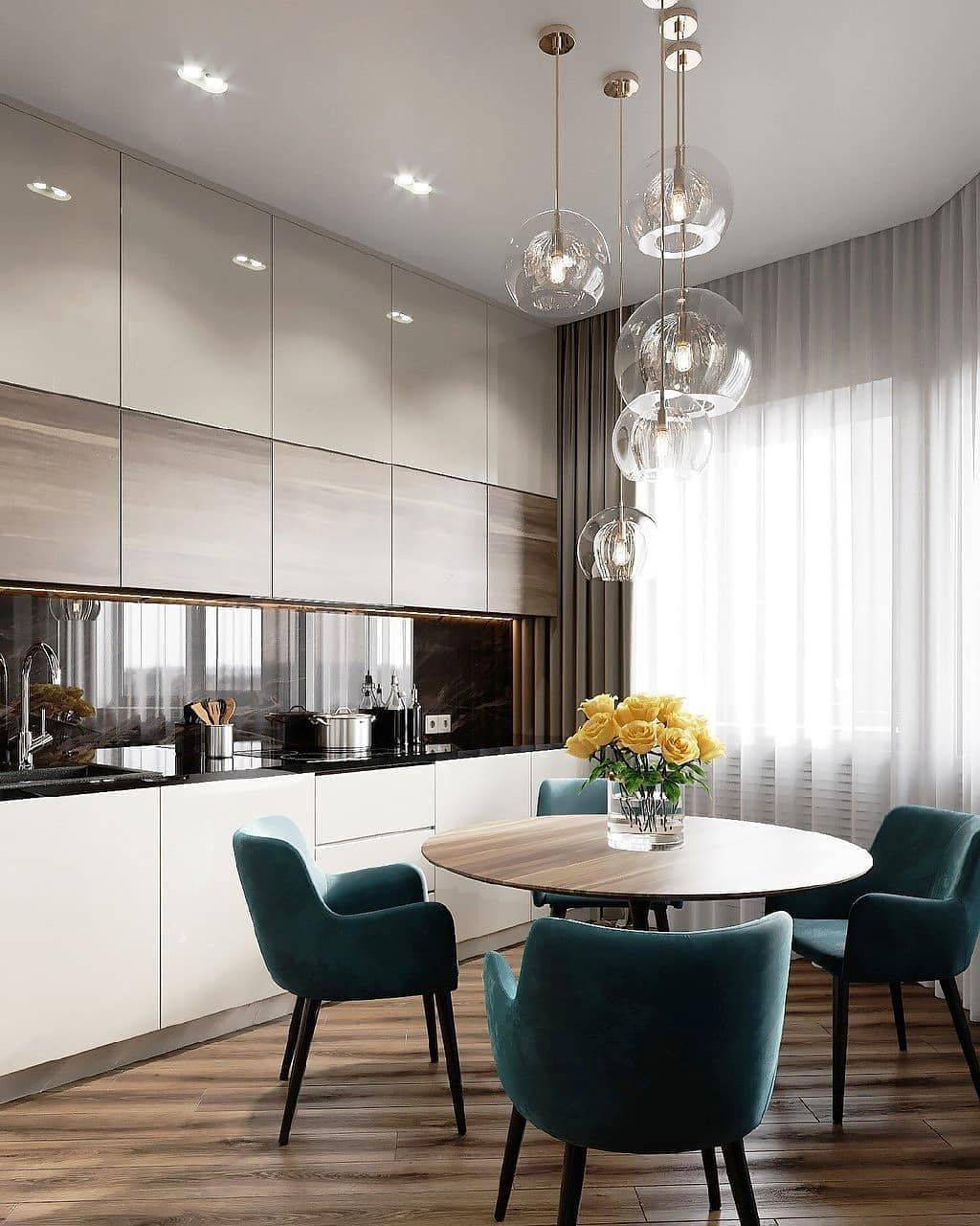 Актуален также эклектичный дизайн кухни 2023. Однако в этом случае мебель, отделка и декор должны быть выполнены в оттенках одной цветовой гаммы или количество используемых цветов не должно быть больше трех.