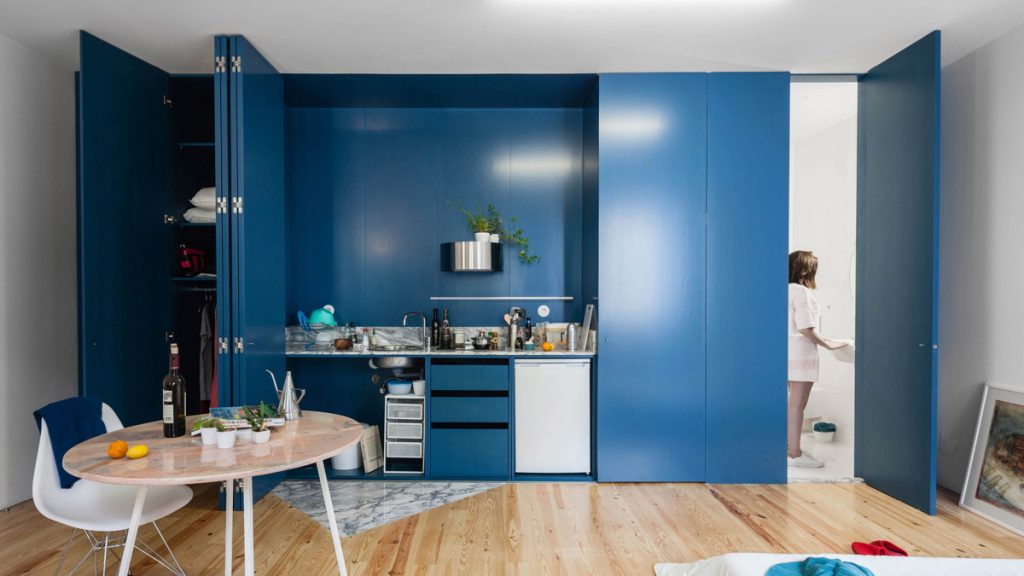 - Скрывающие панели, которые закрывают гарнитур, рабочую, варочную поверхность. Остальное пространство используют, как гостиную.